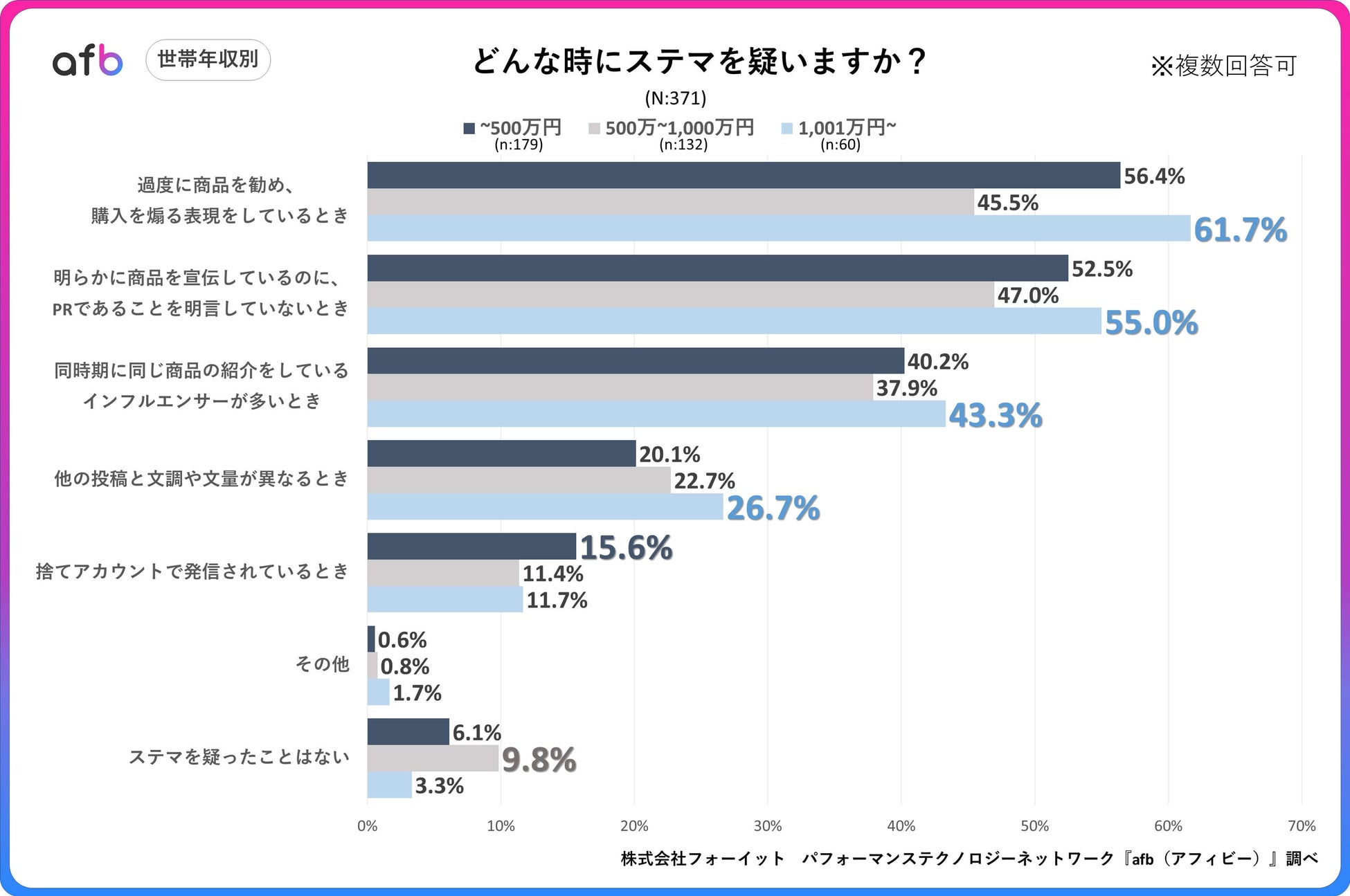 世帯年収別で見ると、全体的にステルスマーケティングを疑う人は「1,001万円~」の層に多いことが伺えます。また、「500万~1,000万円」では「~500万円」と比較しても疑う理由を選択した回答が少なく、「ステマを疑ったことはない」の回答率が最も高くなりました。「500万~1,000万円」の層では、モノを購入する際に金額的な選択の幅が広がり、それまで候補に挙がらなかった価格帯の商品について、それが感想なのか広告なのかが分からずステルスマーケティングを疑いにくい状態になってしまうのかもしれません。