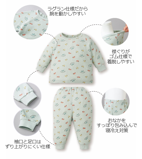 おなかが出にくいよう股上を深くし、袖口と足口はずり上がりにくい仕様にしています。首回りのうしろの部分はゴム入りなので、お子さまひとりでも着脱しやすくなっています。
