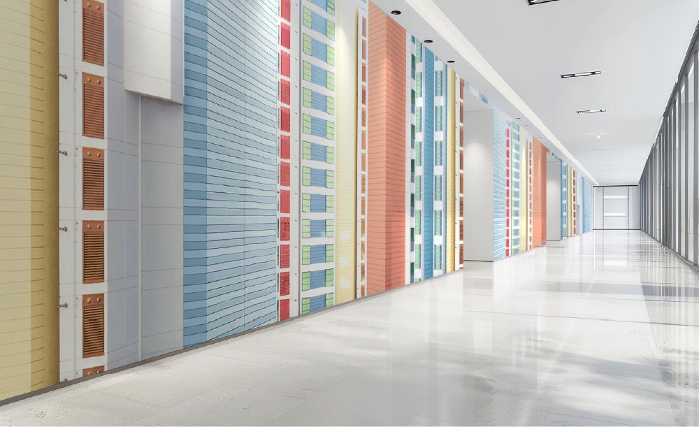 ビル群やひしめき合う住宅など、都市部ならではの風景写真から画像処理によって情報を整理し、均整された印象が一種のパターンとして機能する自身ならではの作風が壁紙として大空間を彩ります。