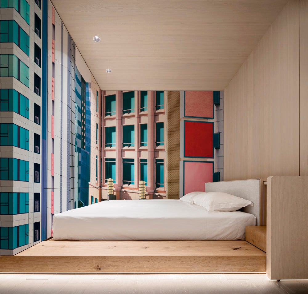 "空間サイズが限られたホテルなどに使ってほしいですね。小さな空間でも、写真の中の建物の遠近感を活かすことで、部屋の広さの感じ方に影響を与えられるのではないかと思います。また、都市部のホテルでは窓が小さく外の景色を感じにくいことが多いですが、壁紙を通じて屋外の雰囲気を取り入れるのも面白そうです。"