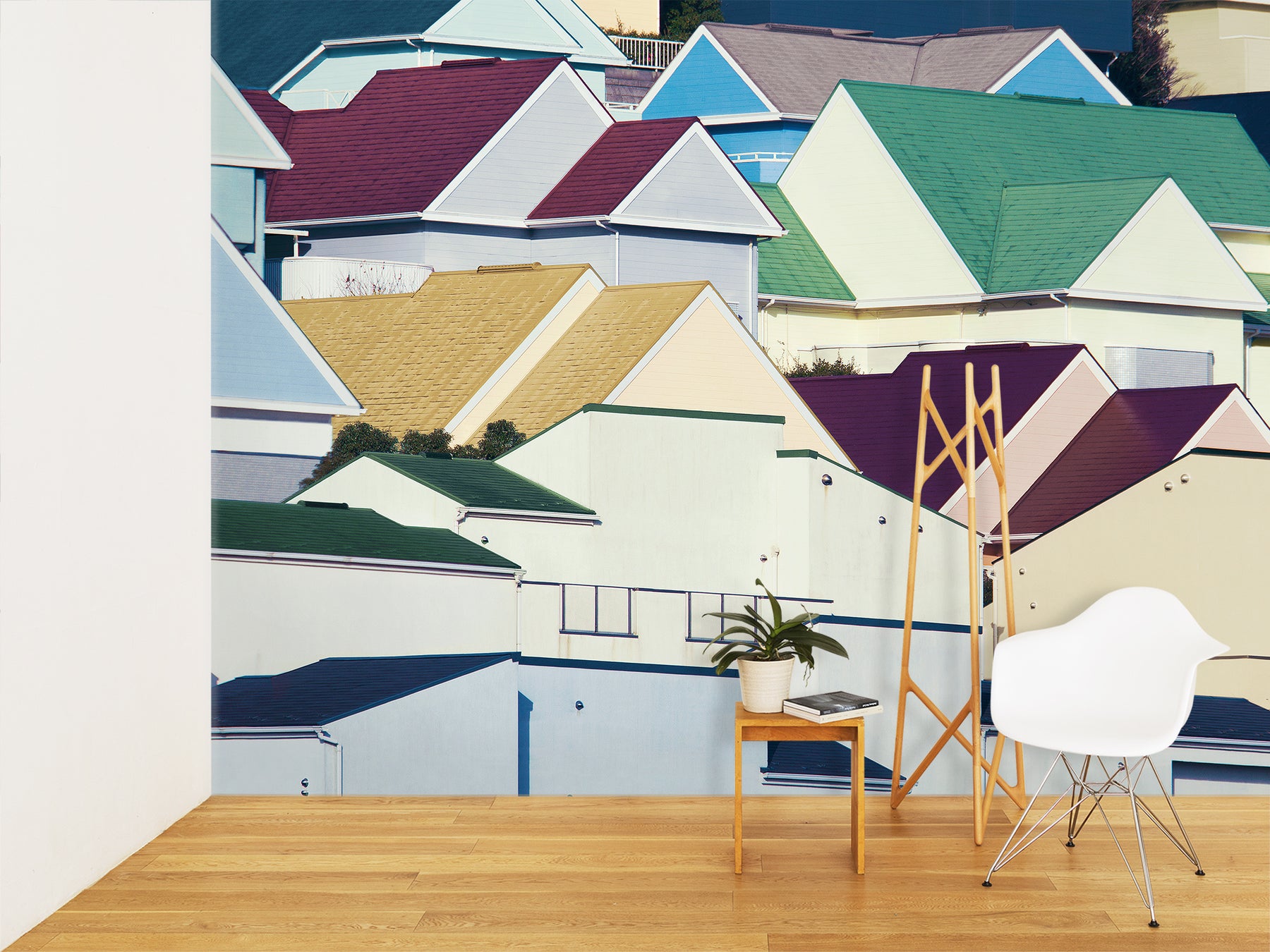 郊外の小高い丘の斜面に沿って住宅が並ぶエリアにて、アイコニックな風景を切り取り屋根のカラーを活かした作品。