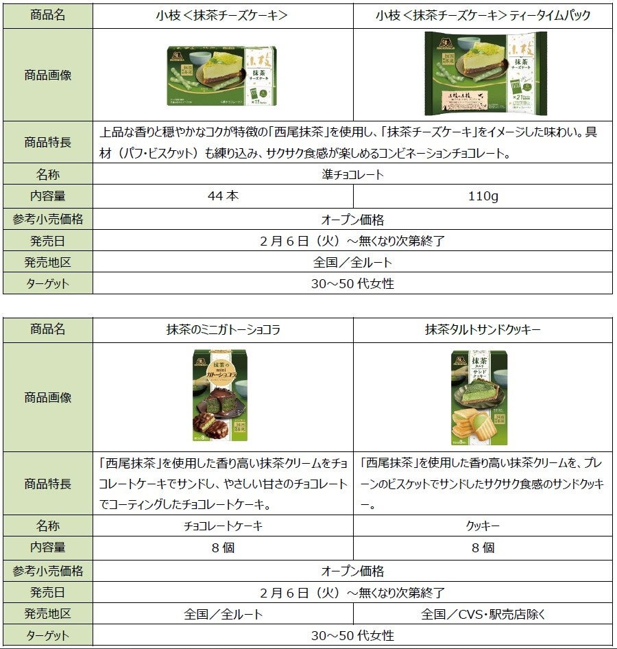 森永製菓株式会社(東京都港区芝、代表取締役社長・太田 栄二郎)は、抹茶商品が店頭を彩るこの季節に、「小枝<抹茶チーズケーキ>」2品と「抹茶のミニガトーショコラ」「抹茶のタルトサンドクッキー」を2月6日(火)より期間限定で新発売いたします。
