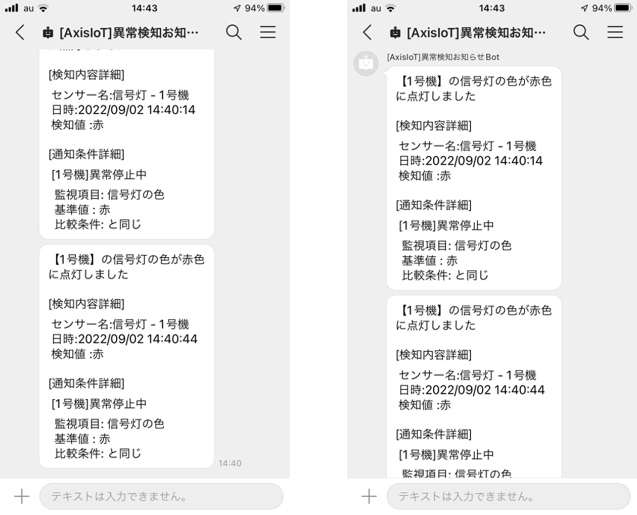 設備の稼働に異常や停止が発生した際、該当設備の名称や稼働停止時間などの詳細情報、現在の状態が記されたメッセージがBotを介して「LINE WORKS」に通知されます。