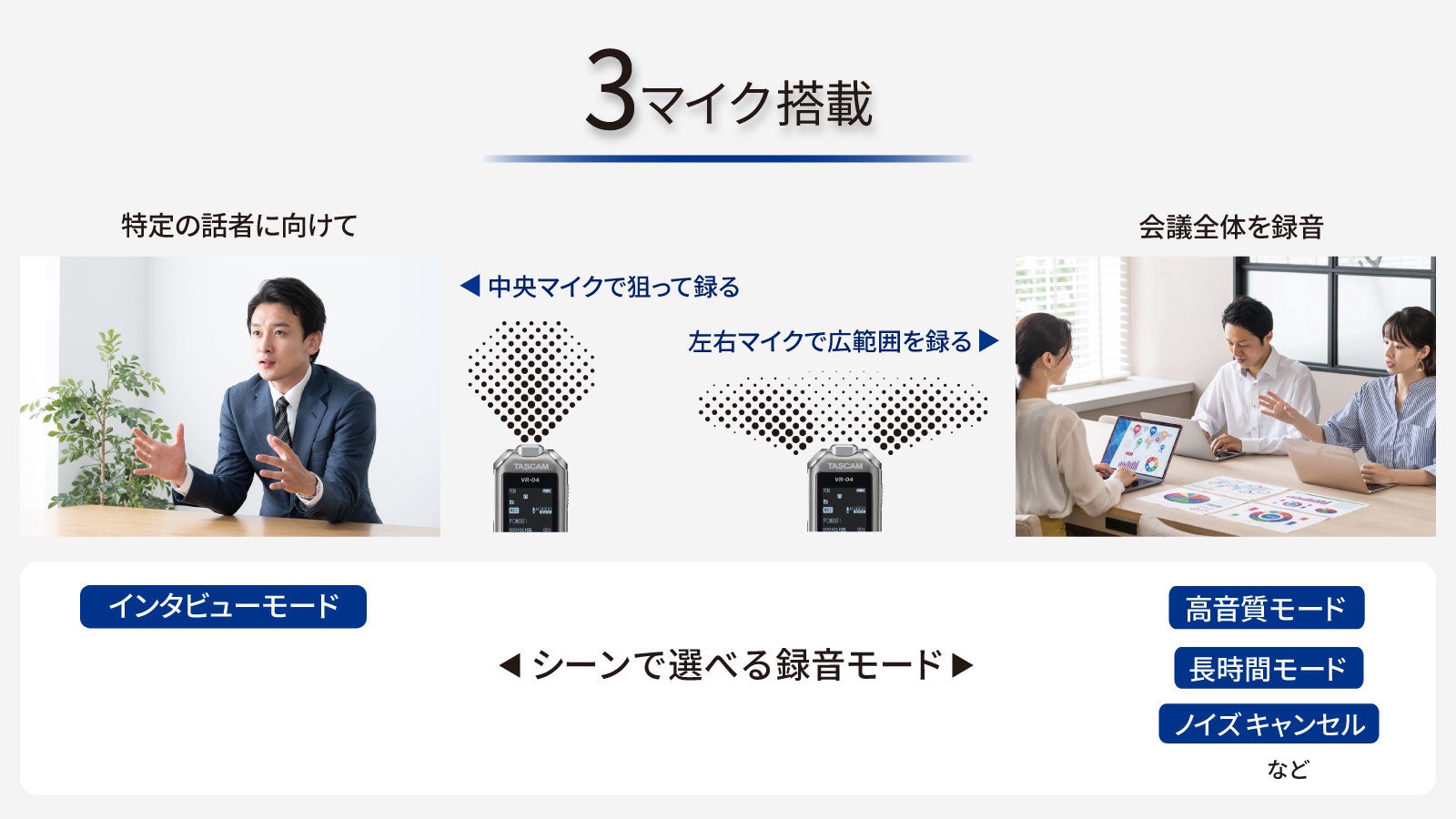 会議録音などのビジネスシーンはもちろん、学校での講義や講演、インタビューなど録音メモに便利なレコーダーです。