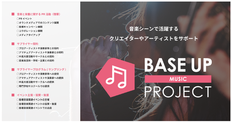 スマートフード完全栄養食である「BASE FOOD」を日常的に取り入れていただくことで、歌手、アイドル、演奏家、作曲家など、各種音楽シーンで活躍する人たちの健康的なカラダづくりや、パフォーマンス向上の“ベースアップ“をサポートしていくプロジェクトです。