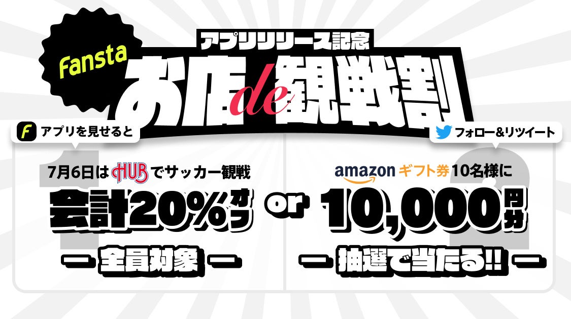 本キャンペーンは、Fanstaアプリを利用したスポーツバーでのスポーツ観戦の促進につなげるため、Fansta公式Twitterをフォロー&リツイート及びFanstaのアプリダウンロードでお得な特典が受けられるものです。7月6日(水)は対象の HUB各店舗で、Fanstaアプリ内のキャンペーンバナーを提示すると会計が20%オフとなります。また、キャンペーン期間中にFansta公式Twitterをフォロー&対象ツイートをリツイートすると、Amazonギフト券1万円分が抽選で10名様に当たります。