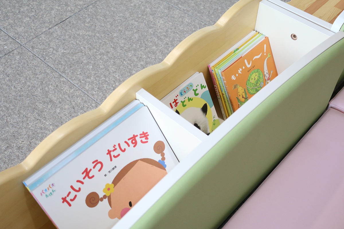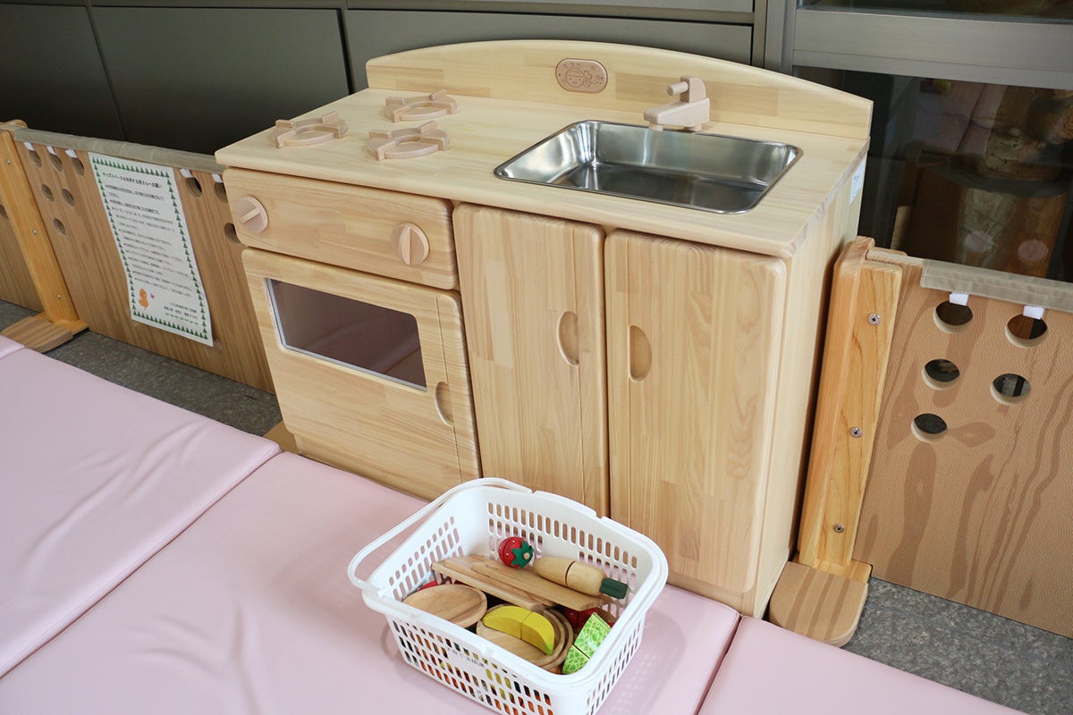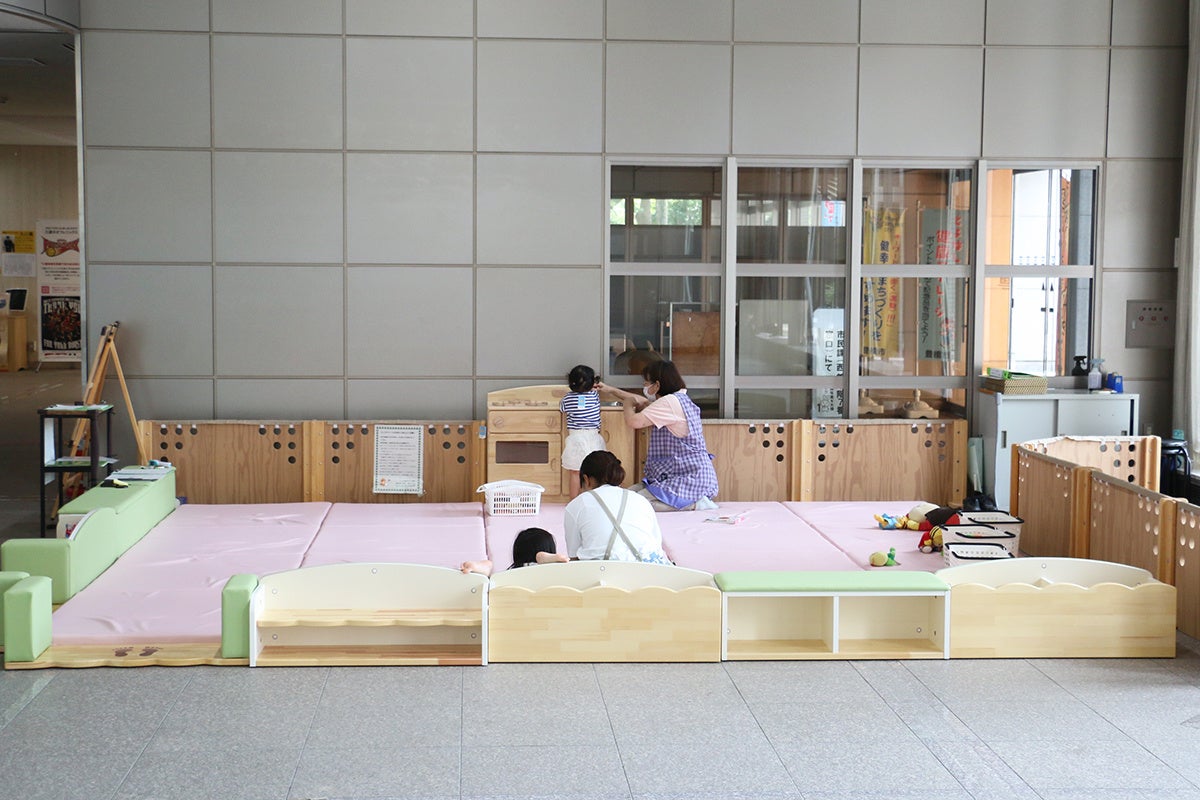 キッズスペースを設置するのは市役所東館の1階で、約16㎡のキッズスペースにはクッション性のあるマットを敷き詰め、ままごとセットや絵本、ぬいぐるみを備えるなど、幼い子どもが楽しんで過ごせるように工夫しました。おむつ交換や授乳のできる専用の部屋や子ども用便座などを備えた多目的トイレも近くに配置されています。