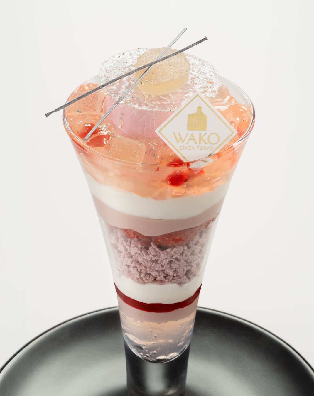 宝石のキラキラとした華やかさを表現した限定パフェ。天面のアメ細工はダイヤモンドを、2本のシルバー色の棒状にしたチョコレートは、ダイヤモンドを選び抜くピンセットを表現しました。ルビーショコラアイスクリーム、ロゼワインジュレ、イチゴやフランボワーズの果肉などで、新作リングにあしらわれたピンクメレダイヤモンドをイメージしたデザインに仕上げました。