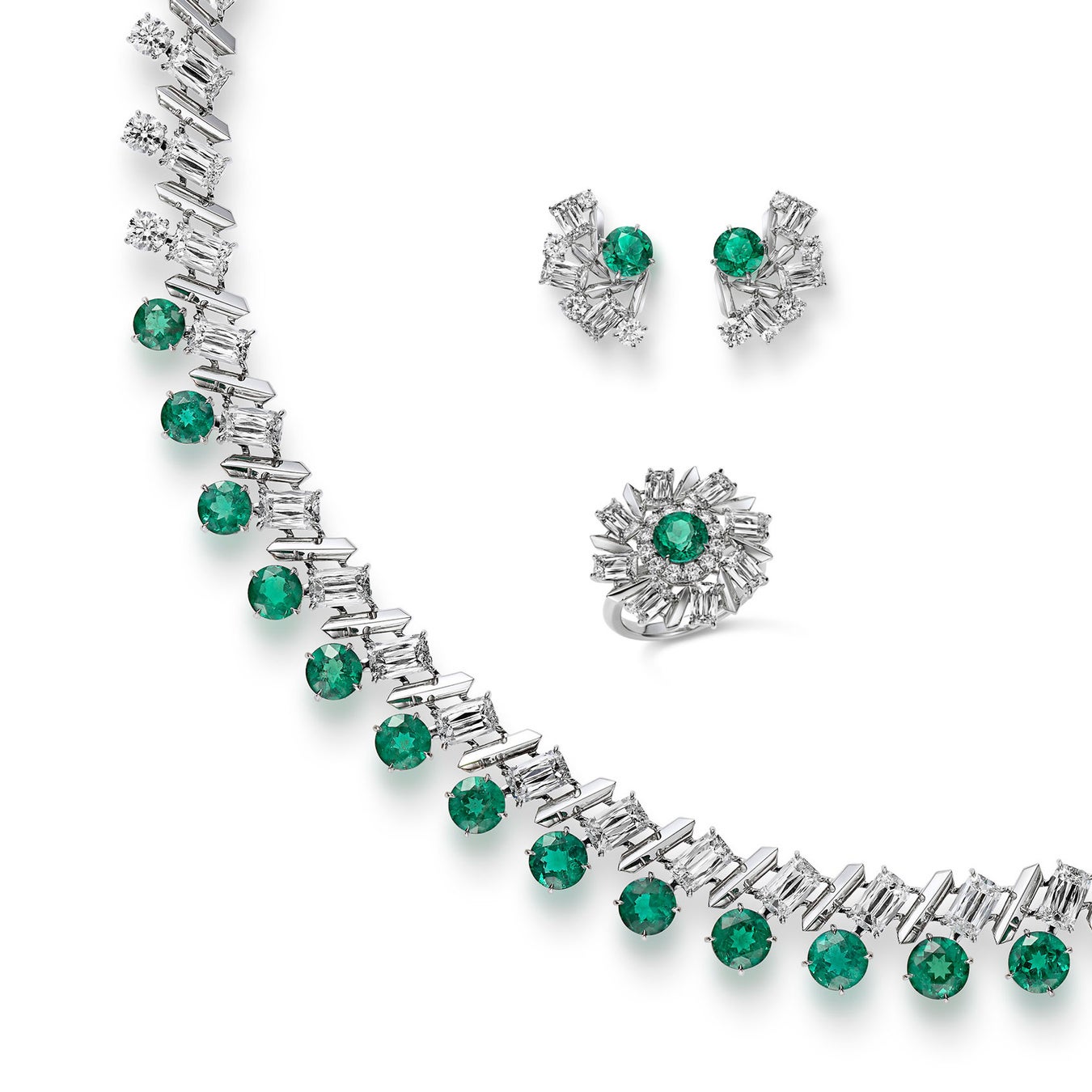 照りが美しく色味とカットが揃った鮮やかなエメラルドと、瑞々しいアショカダイヤモンド、シャープなプラチナの輝きのコンビネーションをお楽しみいただけるハイジュエリーが登場します。