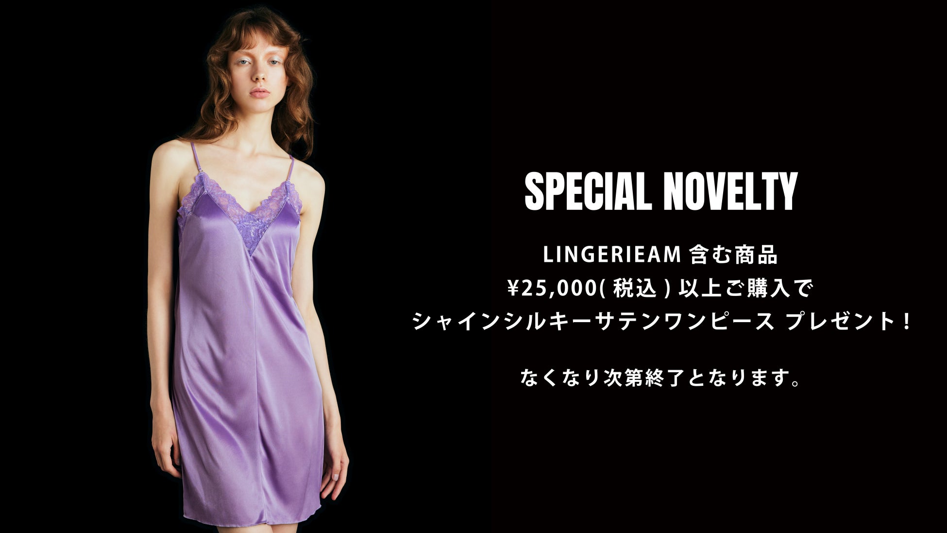 公式オンラインストア/全国店舗にてノベルティキャンペーン開催中。対象商品を含む25,000円(税込)以上ご購入で[シャインレースシルキー ワンピース]をプレゼント。