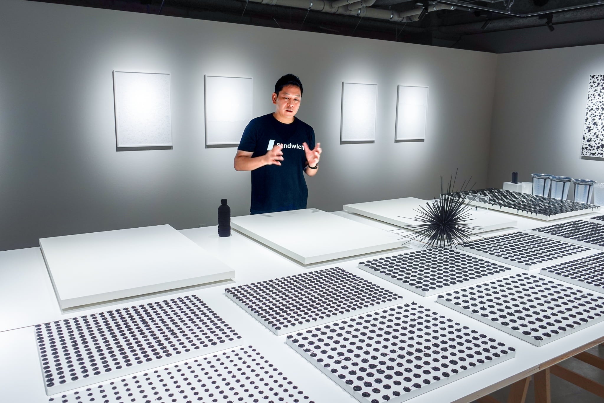「会場はできるだけ普段のSandwichのスタジオを再現しました。机の上に配したペットボトルや缶をモチーフとする《Velvet》シリーズの作品も、制作中に飲んだ飲料の容器が無造作に置かれている様子をイメージしています。また、机の中央にある黒いオブジェは、無数の突起で構成されており、エネルギーの拡散と凝縮を同時に想起させます」と会場構成や各作品について説明をされました。