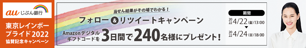 また、本協賛開始に合わせ、プライドフェスティバル開催期間の2022年4月22日から「240名様に当たる!当せん結果がその場でわかるフォロー&リツイートキャンペーン」(以下 本キャンペーン)を実施します。本キャンペーンでは、性の多様性を表し東京レインボープライドの象徴でもある虹(ニジ)にかけ、auじぶん銀行Twitter公式アカウントをフォローし、キャンペーン投稿をリツイートしていただいたお客さまの中から抽せんで240名さまにAmazonギフトコード500円分をプレゼントします。加えて開催期間中、auじぶん銀行ブースに設置しているSNSパネルにてご自身との写真撮影かつ、2つのハッシュタグ「#TRP2022」「#auじぶん銀行」をつけSNSへ投稿いただいた方を対象に、イメージキャラクター水原希子さんの特製クリアファイルをプレゼントします。