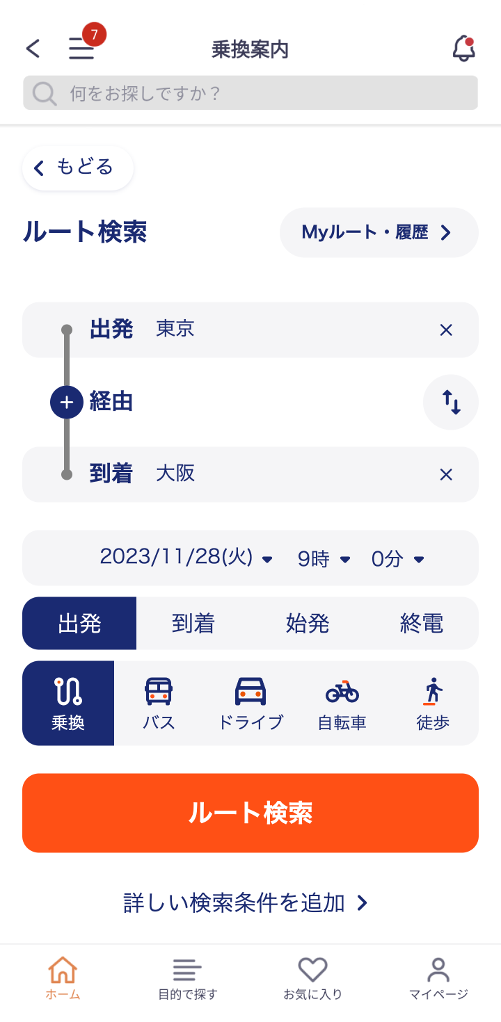 アプリトップ画面の「ルート検索」ボタンをタップ、もしくは「乗換案内」>「ルート検索」の順にタップしてご利用ください。
