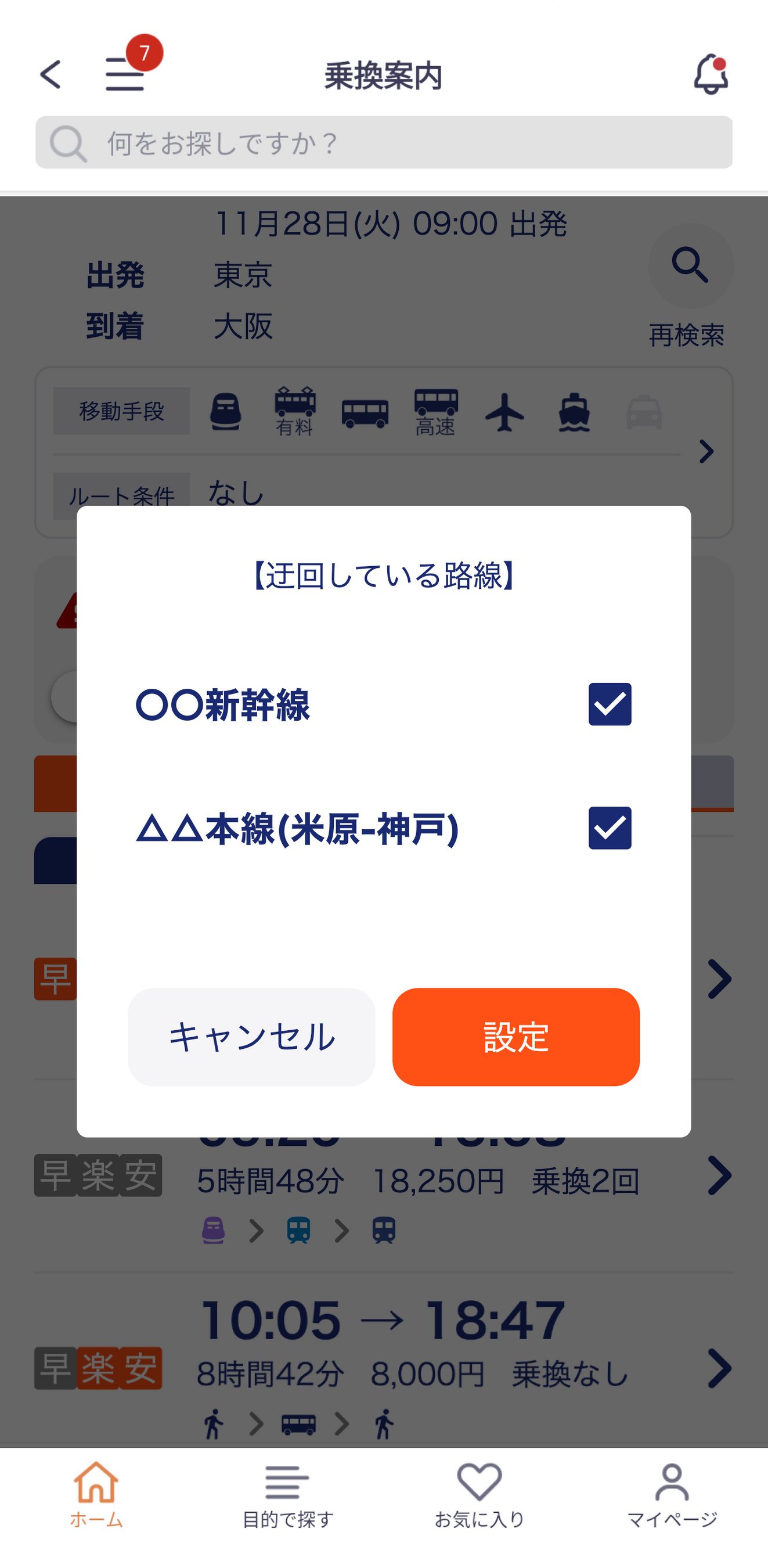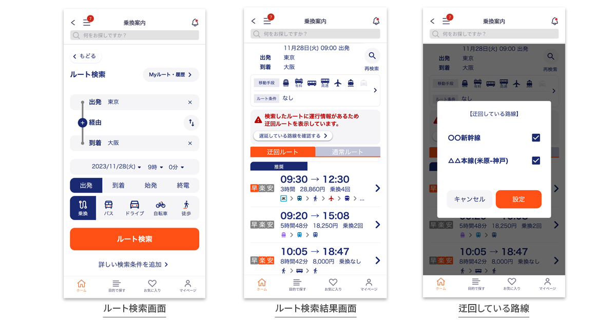 ルート検索結果画面上で、「どの路線を迂回設定しているか」を確認することも可能です。