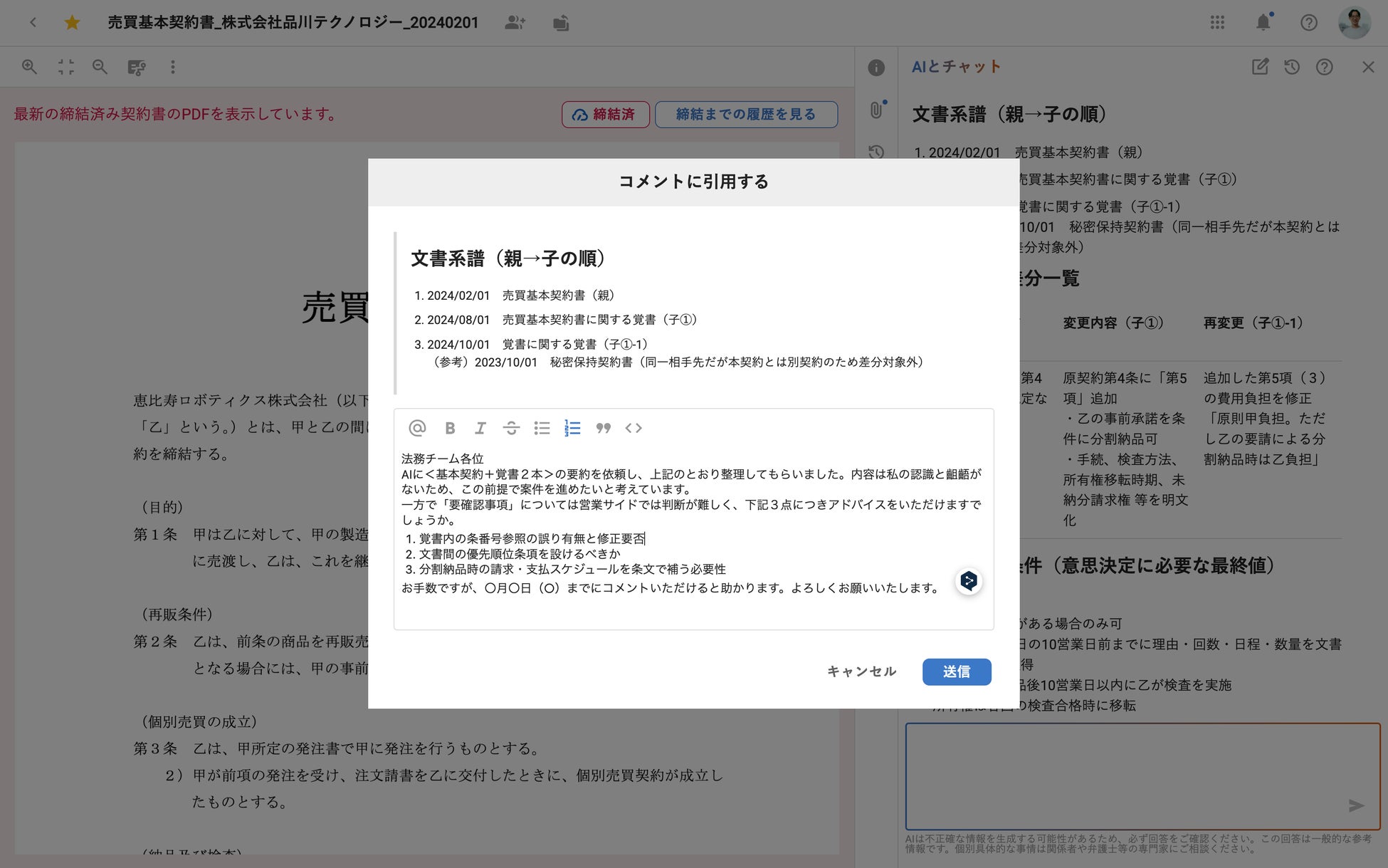 今回リリースした「AIコメント引用機能」では、AIが提示した修正文案や示唆をワンクリックでコメントスレッドに貼り付けられるようになりました。AIの提案内容と前提情報が紐づくため、法務・事業部門双方が同じ情報をもとに議論・判断できます。