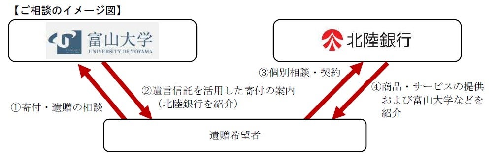 これにより、富山大学は、遺言による寄付を希望される方に対して、具体的な相談先として当行を紹介いたします。当行は、相続・信託業務で培った知見を活かし、本部担当者が寄付や遺言作成の手続き等についてアドバイスを行い、必要に応じて、遺言信託などの商品・サービスをご提供いたします。また、当行からも、お客さまのご要望に応じて、寄付先として富山大学をご紹介いたします。