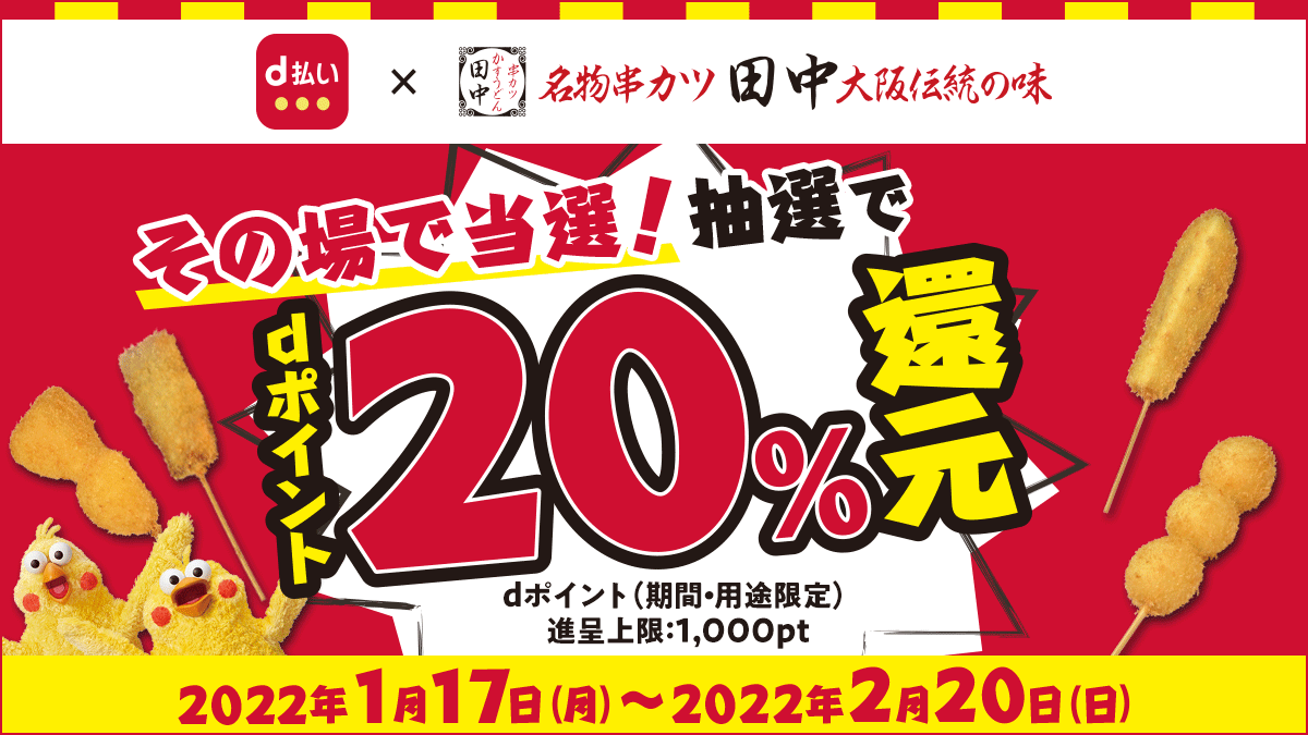 株式会社串カツ田中ホールディングス(本社:東京都品川区東五反田、代表取締役社長:貫 啓二、以下:串カツ田中)は、1月17日(月)~2月20日(日)の期間限定でd払い®ポイント還元キャンペーンを実施いたします。d払いで500円(税込)以上のお支払いをすると、20人に1人の確率でお会計金額の20%分のdポイントが還元されるキャンペーンです。