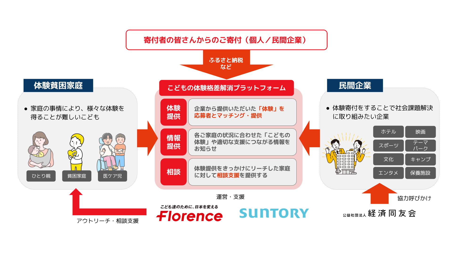 この「こどもの体験格差解消プラットフォーム」は、ひとり親、貧困家庭、医療的ケア児家庭などの「体験貧困家庭」へ体験を届けるものです。こどもの体験格差という社会課題の解決に向けた活動に共感する企業から、体験プログラムや機会の提供をいただき、ご家庭の状況や住んでいる場所など、属性に合わせて情報を提供します。