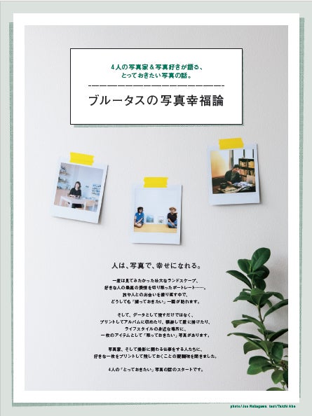 株式会社マガジンハウス(本社:東京都中央区、代表取締役社長:片桐隆雄)発行のカルチャー誌『BRUTUS』(編集長:田島朗)は、富士フイルム株式会社が開始した「写真幸福論」プロジェクトの意義に共鳴しBRUTUSの視点から写真と人の幸せを伝える「ブルータスの写真幸福論」を企画、公開致しました。「写真はもっと楽しい。」をテーマに今だからこそ伝えたい写真の魅力を特集した本誌(10/16発売)には企画をおさめたスペシャルBook が綴じこまれ、またBRUTUS.jpには特別サイトを開設し多くのみなさまにもご覧いただけます。