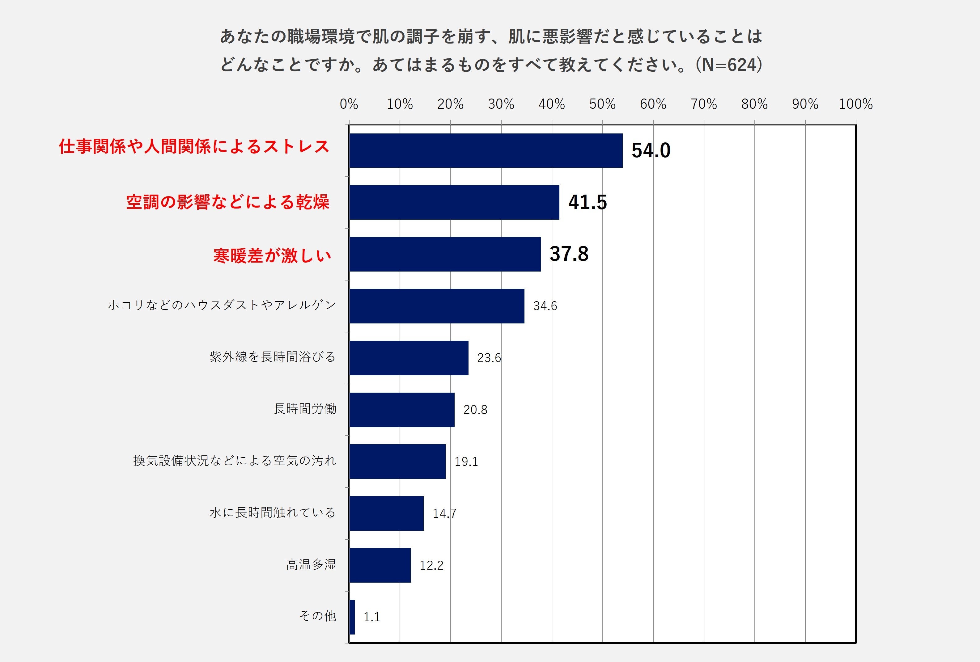 「職場環境」によって何らかの肌トラブルが起きていると感じている女性(前設問回答62.7%)に、どのような職場環境が原因となっていると感じるかという質問では、1位に「仕事や人間関係によるストレス」がランクインするという衝撃の結果に。