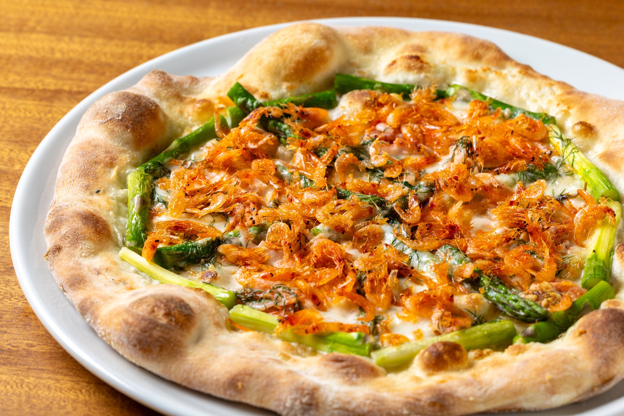 ・桜海老とグリーンアスパラガス モッツァレラチーズのピッツァビアンコ3,410円 ★新作