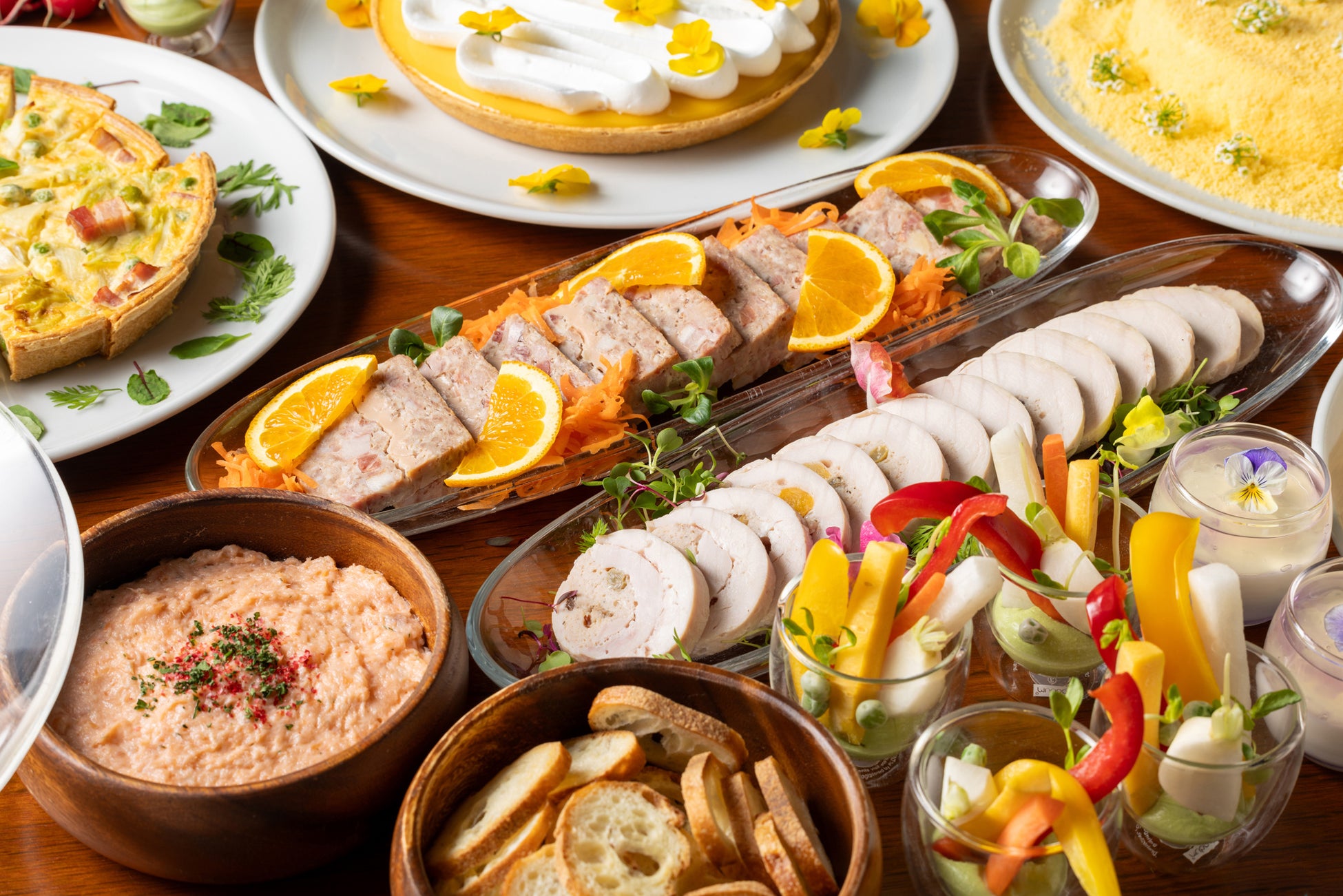 伝統的なビストロ料理をスタイリッシュにアレンジしたオールデイ ダイニング「フレンチ キッチン」では、5種類から選べるメインと、ブッフェスタイルで前菜とデザートをお楽しみいただけるセミブッフェディナーが登場いたします。ヨーロッパで春の宝石とも呼ばれているホワイトアスパラガスを添えたグリルビーフやタルト、旬のアサリの旨味がスープに溶けだした桜鯛のポワレなど、春の食材をふんだんに使用するメインディッシュ5品をご用意。ブッフェテーブルには、やさしい甘さが広がる新玉ねぎと風味豊かな桜海老のキッシュや、カラフルな春野菜が華やかな前菜、さらにミモザの花をイメージしたバニラムースや、エルダーフラワーが香るショートケーキなどの目でも舌でも春を感じるスイーツが並びます。お料理のみのプランのほか、シャンパンフリーフロー付きプランもご用意いたしますので、春風が心地よい季節にはシャンパンを片手に開放的なテラスでお過ごしいただけます。