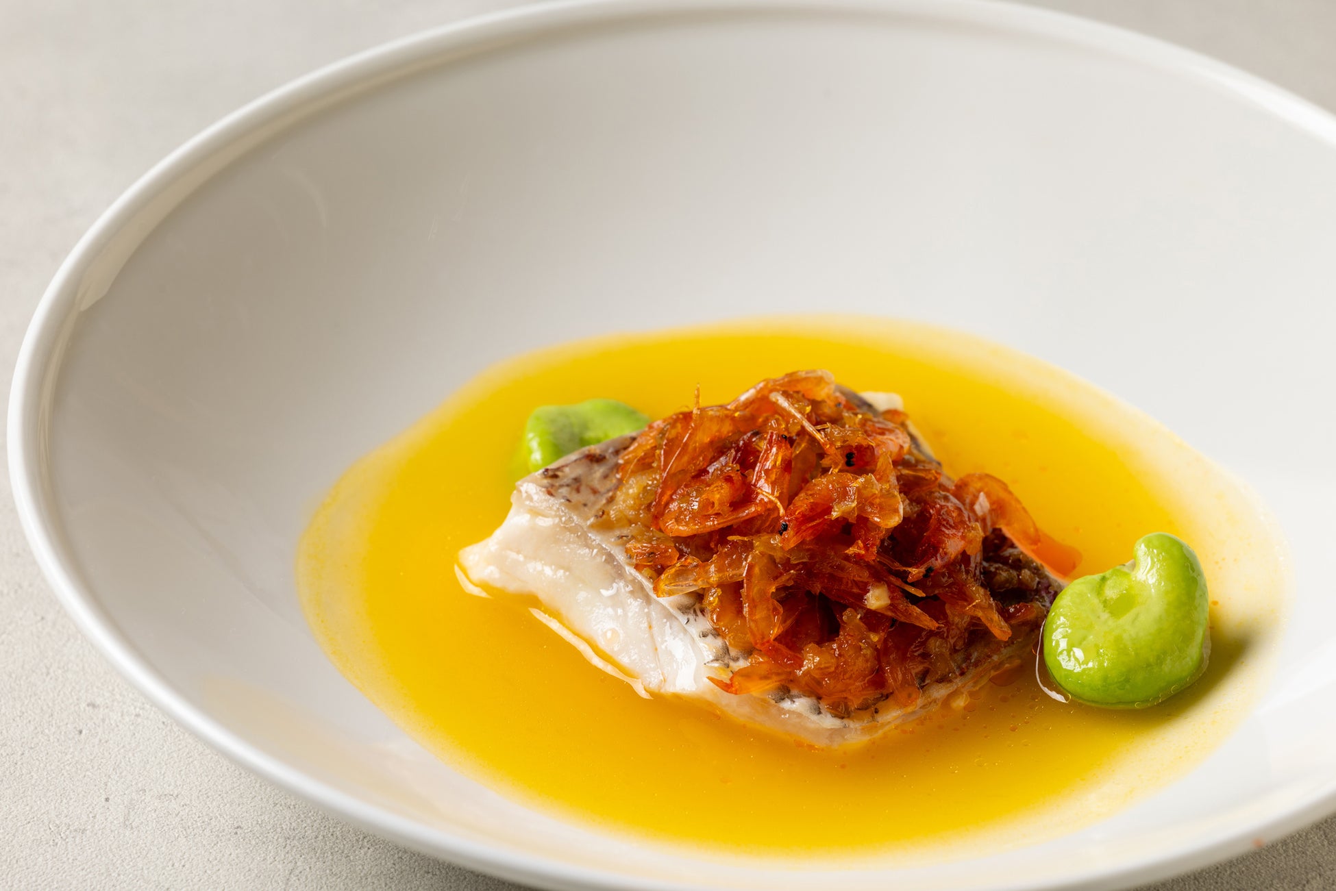・桜鯛のポワレ 海老とアサリ 白ワインソース プチポワ・フランセーズ