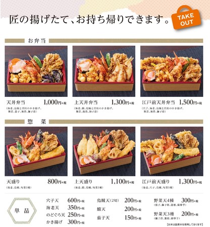 「冬の贅沢天丼」は、ご自宅や職場でのお食事やお土産として、テイクアウトも可能です。