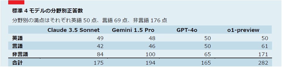 今回の比較により、これまで生成AIが不得意だった文章整序(言語)、特殊計算(非言語)の正答率がOpenAI o1で初めて80%に達しました。正答数では、OpenAIのo1-previewが295問中282問正解(正答率95.6%)で、2位のアンソロピックのClaude 3.5 Sonnetの175問正解(同59.3%)に大差をつけました。