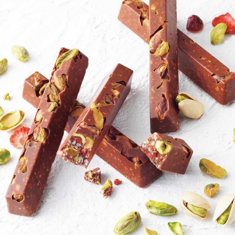 ミルクチョコレートに塩がけしたローストピスタチオをまるごと入れ、さらに刻んだローストピスタチオ、ドライクランベリー、フリーズドライのストロベリー、クッキークランチやアーモンドパフを合わせました。ベリーの酸味をアクセントに楽しい食感とピスタチオの旨みがぎっしり詰まったチョコレートバーです。