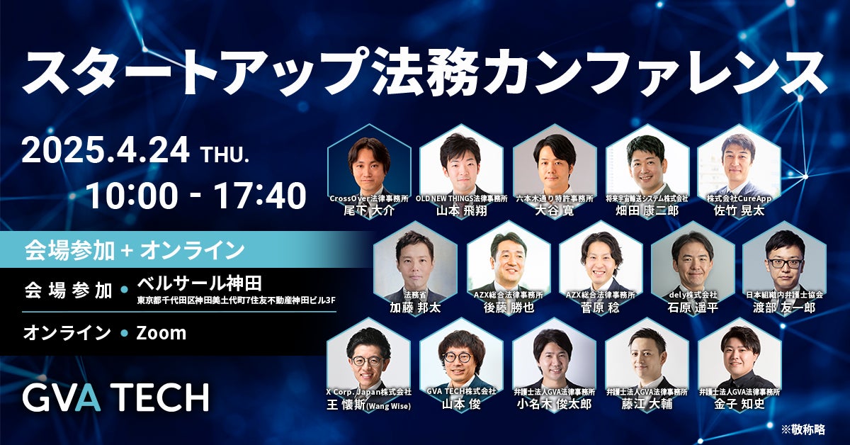 GVA TECH株式会社(代表取締役:山本 俊、以下GVA TECH)は、スタートアップのIPO準備からファイナンス、知財戦略、規制戦略、さらには外資系メガベンチャーの最先端事例までを第一線の実務家が解説する「スタートアップ法務カンファレンス」を開催いたします。