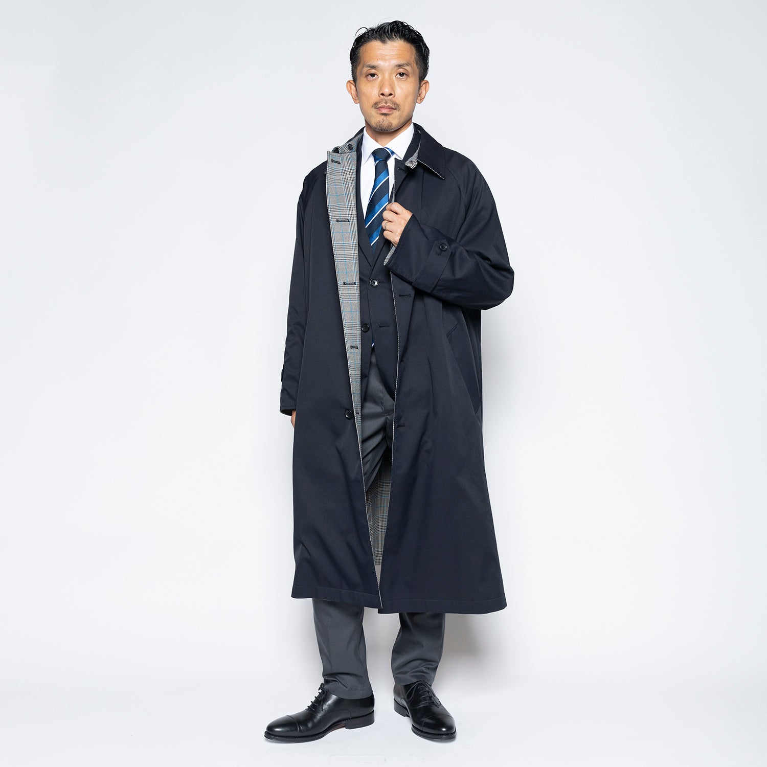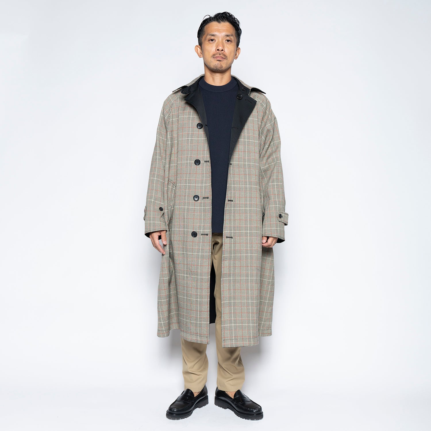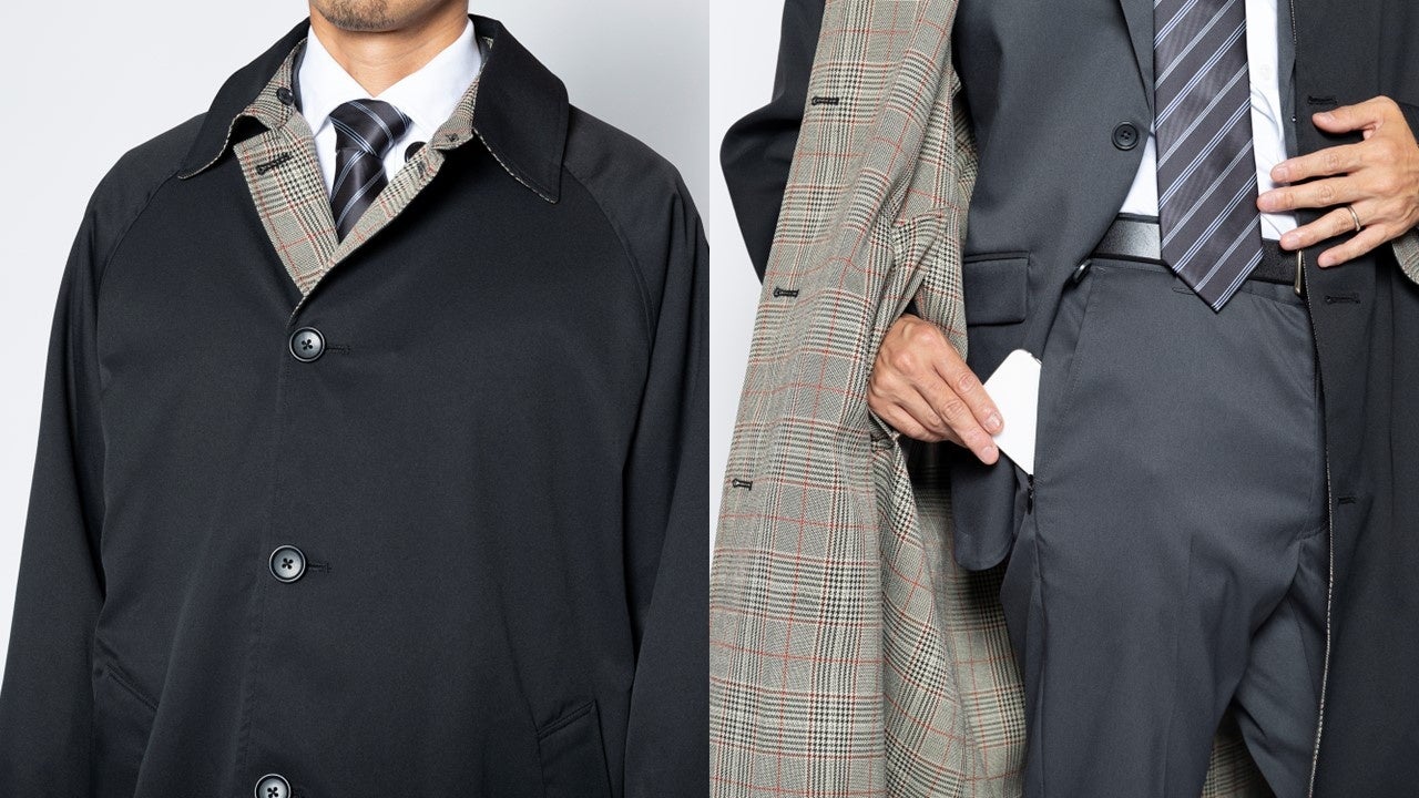 特 徴:用途や気分によって使い分けられるリバーシブルコート。表側には自社開発素材「ultimex/アルティメックス」を使用し、速乾、撥水、ストレッチ、形態安定(イージーケア)の機能性を備えています。裏側には素材感の異なるポリエステルのグレンチェック柄を使用し、気分によって使い分けられるリバーシブル仕様に仕上げました。コートを脱がずにジャケットやパンツのポケットに収納した小物を取り出せる貫通式ポケットと、500mlのペットボトルが楽々入る大容量のポケット付き。ゆったりとした大きめのシルエットなので中に着る服を選ばずに着用でき、また自宅の洗濯機で丸洗い可能なので毎日清潔に着用できます。