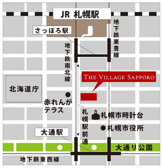 当社は、地下鉄「さっぽろ駅」徒歩2分、地下鉄「⼤通駅」徒歩4分、JR「札幌駅」徒歩6分というアクセスの良い好⽴地に新築オフィスビル「THE VILLAGE SAPPORO」の開発を進めています。(2026年4⽉竣⼯予定)