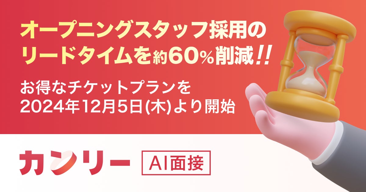 店舗事業者向けの集客・採用支援サービスの開発・提供を行う株式会社カンリー(所在地:東京都品川区、代表取締役:辰巳 衛, 秋山 祐太朗、以下カンリー)は、2024年10月から提供開始している「カンリーAI面接」の導入企業数がリリース初月で100社を超え、実際に大手中華チェーンなどを運営する飲食店などにおいて、オープニングスタッフ採用のリードタイムを60%削減しています。今回、さらに多くの新店舗オープンを支援すべく、コストダウンを加速するお得なチケットプランを2024年12月5日(木)に開始しましたことをお知らせいたします。