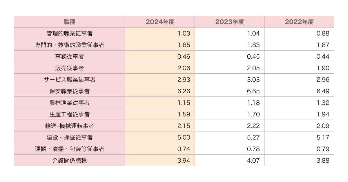 有効求人倍率における新型コロナ流行の影響は、バブル崩壊後ほどではないものの、リーマンショック後と同程度に低下していると言われています。2024年9月時点の有効求人倍率は1.24(※1)であり、2024年4月以降微増の傾向にあります。特に厚生労働省が公表している主要な職種別の有効求人倍率を見ると、サービス職に分類される職業は、有効求人倍率が3倍前後になっています。