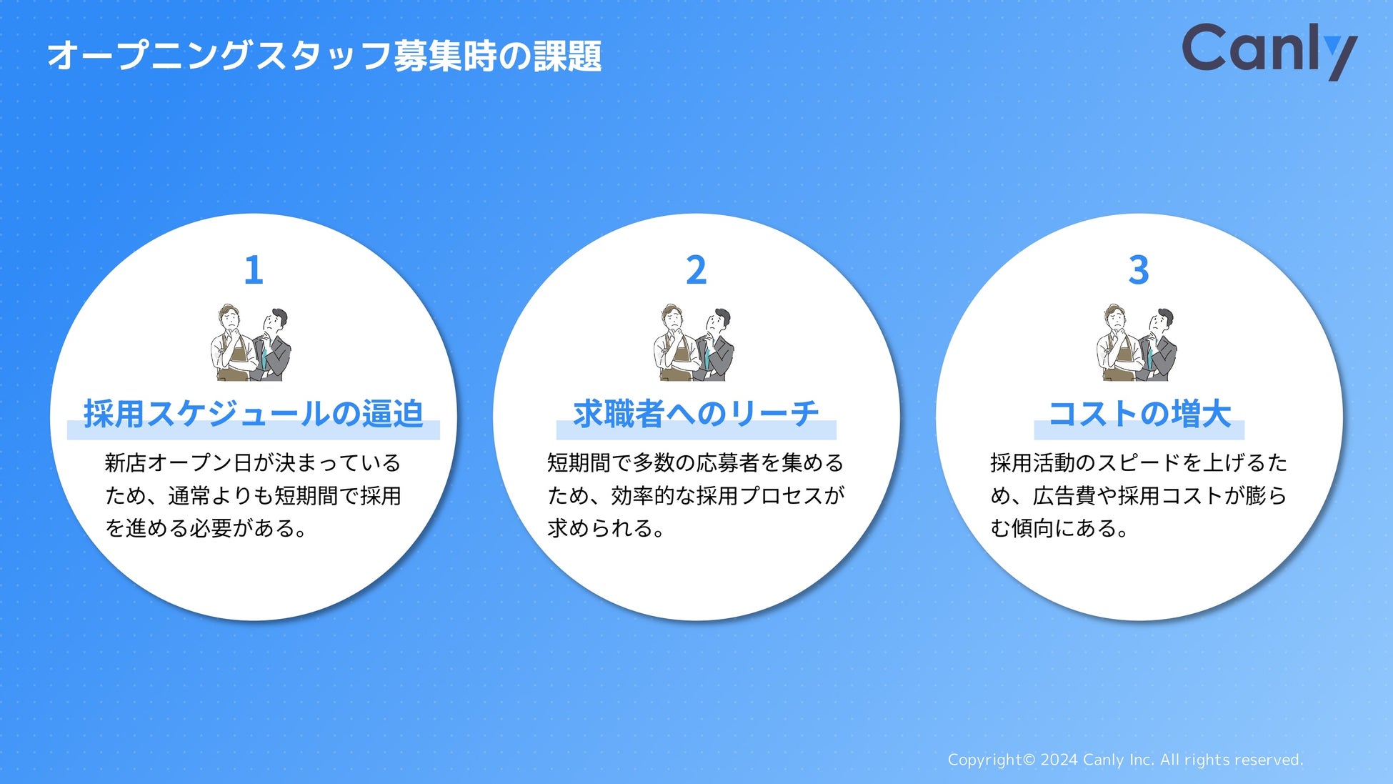 これらの課題に対応すべく、特にオープニングスタッフ採用では効率的で柔軟な採用プロセスが求められています。