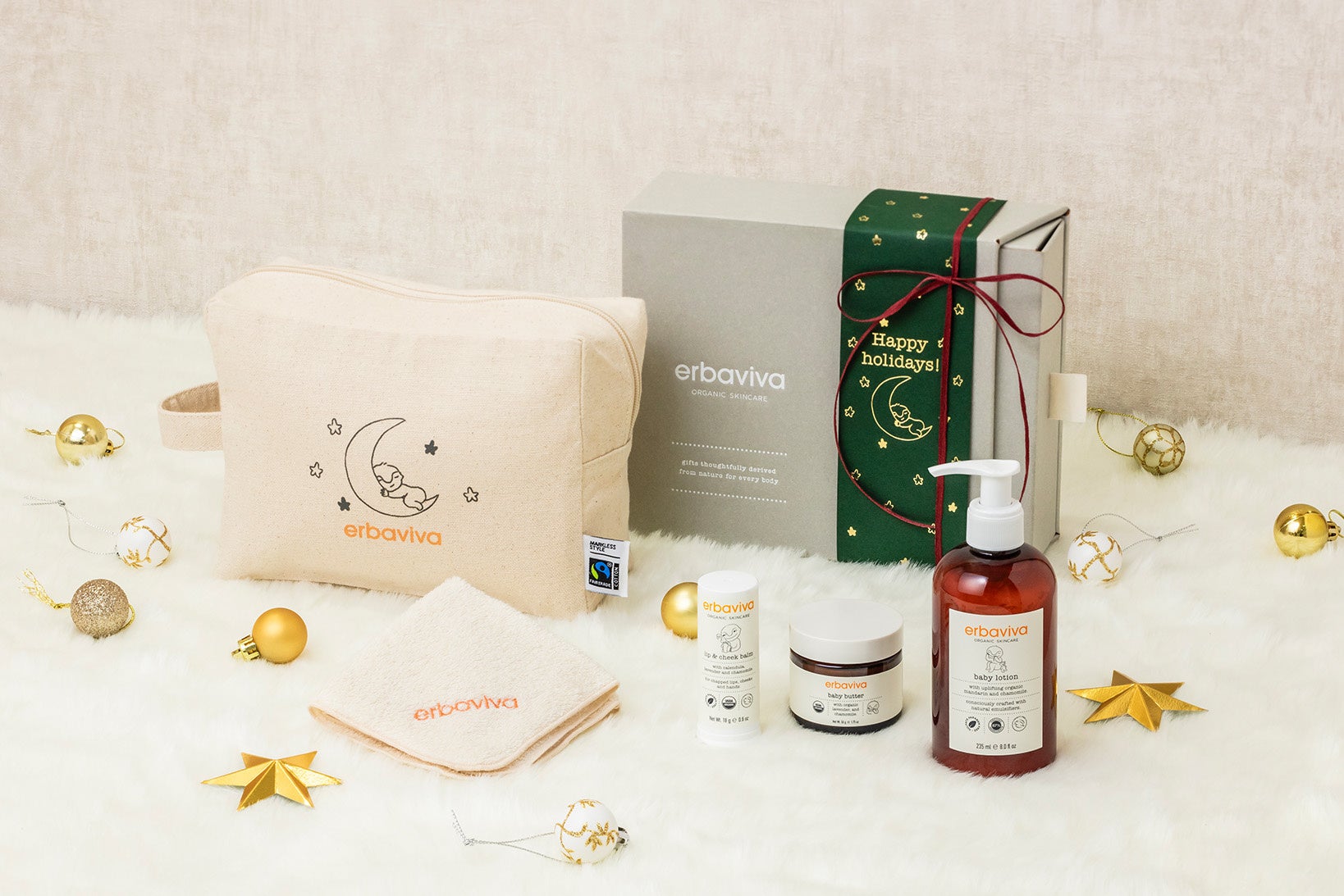 赤ちゃんのお肌をしっとり保湿するアイテム3点、オーガニックコットンハンドタオル、フェアトレードコットンの限定ポーチが揃った特別コフレ。