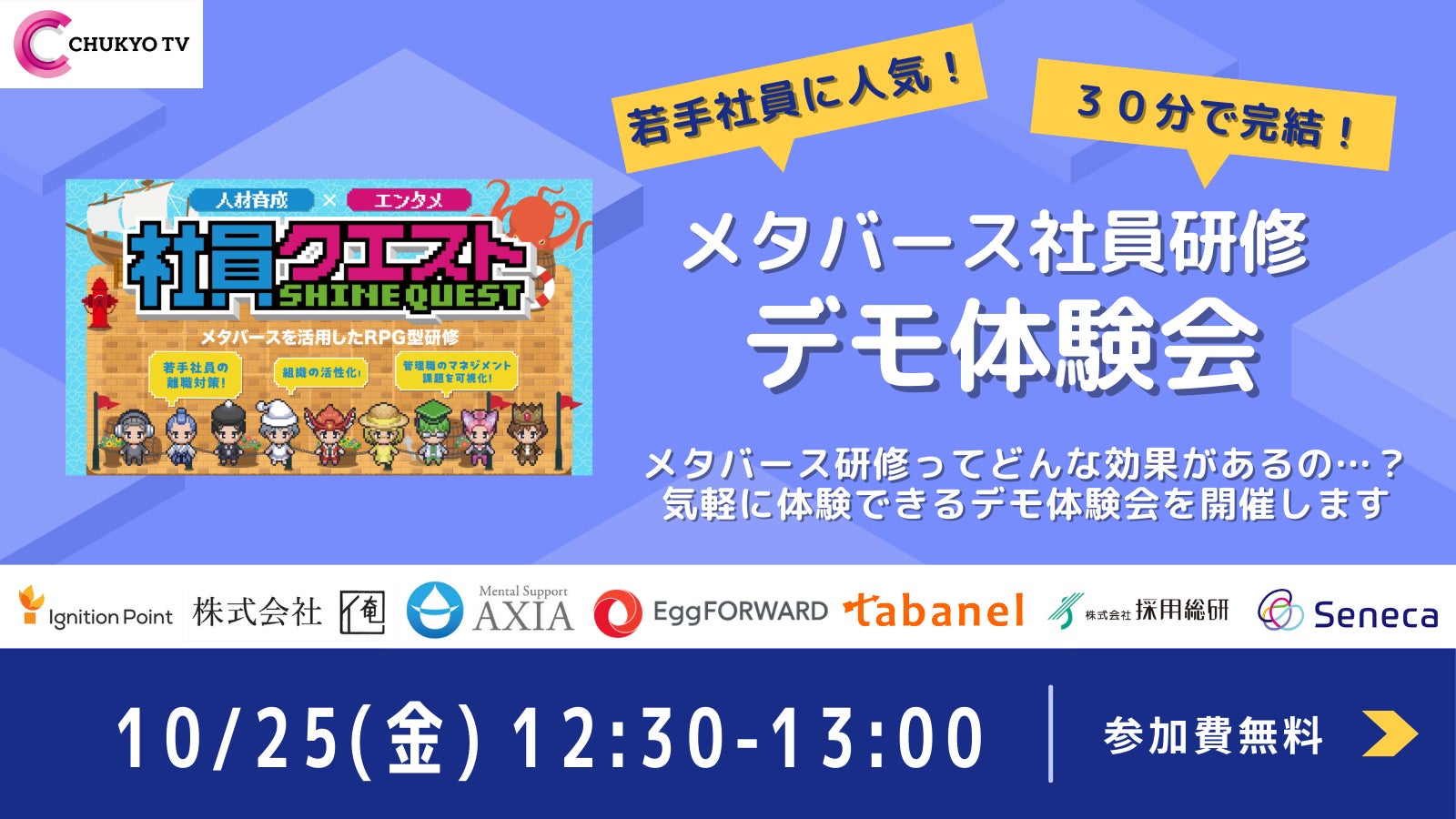 中京テレビが展開するメタバースのゲーム性と匿名性を活かすRPG型ワークショップ「社員クエスト」のデモ体験会を実施します。実際に空間に入っていただき、操作感をご体験ください。