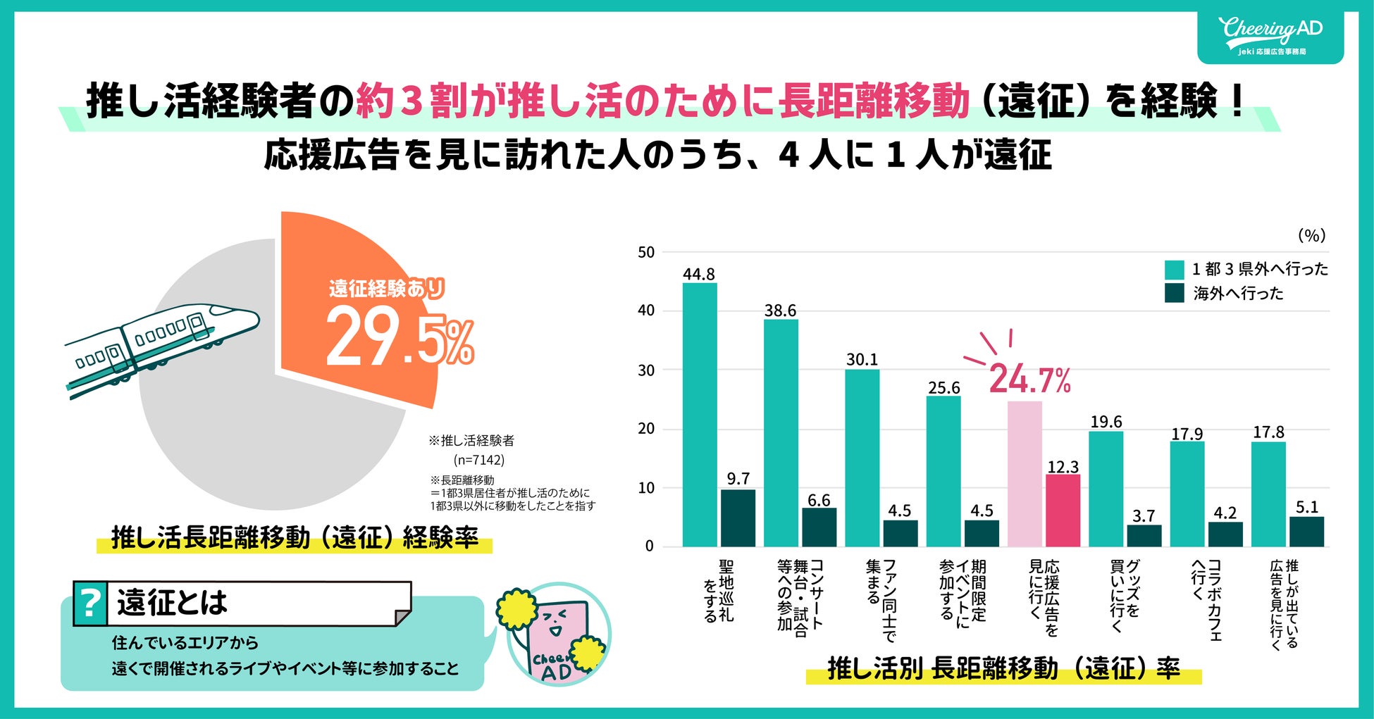 「応援広告」は、推し活経験者の約4割に認知されており、中には応援広告を見るために長距離移動(遠征)をする人も一定数いることがわかりました。さらに、応援広告実施後は、約4割がファン同士のつながりが深くなったと感じ、約8割が応援広告以外の推し活が活発になったと回答しています。
