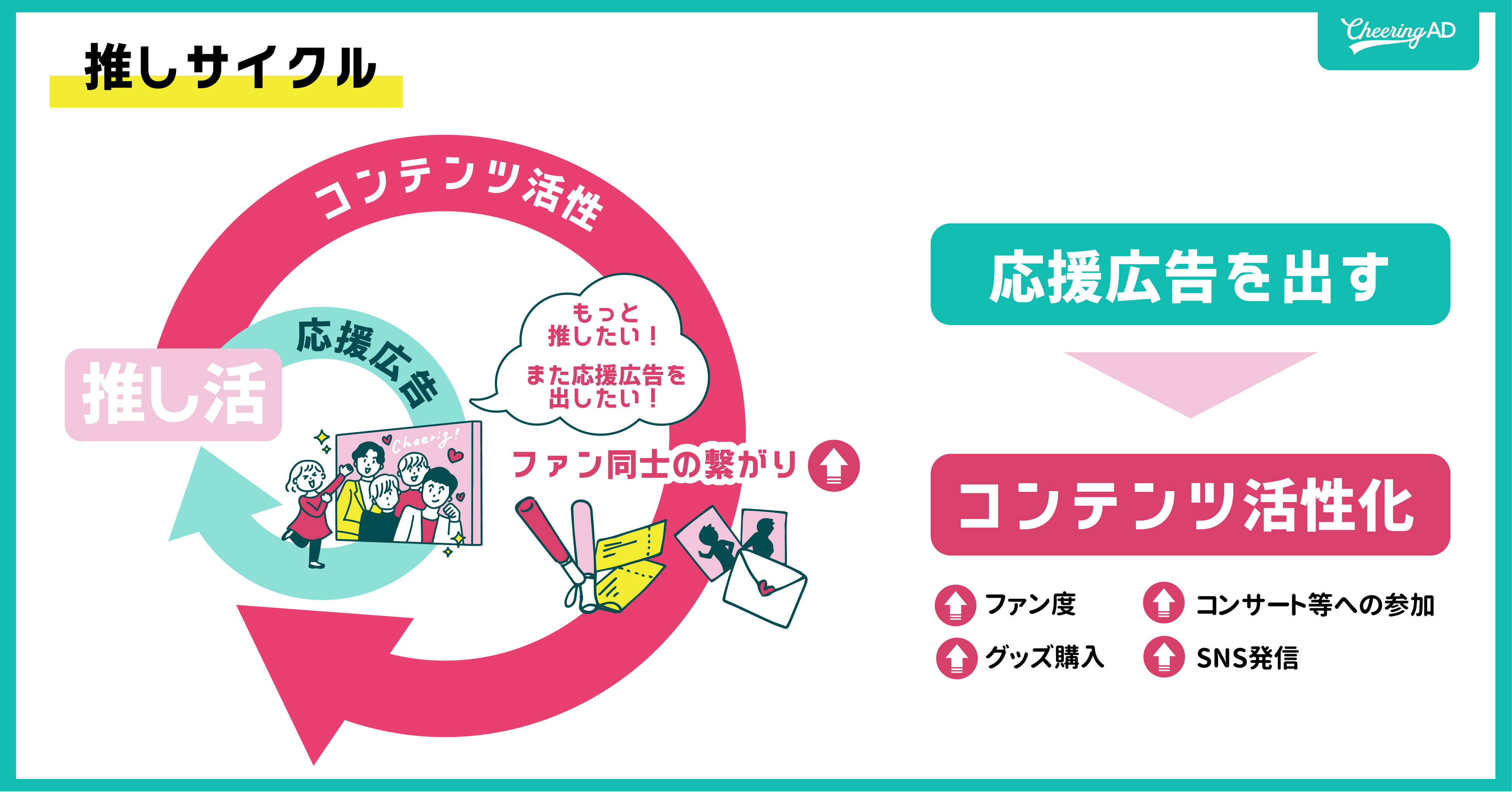 ファンが主体となる応援広告は、ファン同士の共感を生み出し、コンテンツをより活性化させるポジティブなサイクルを生み出すと考えています。私たちはこのサイクルを「推しサイクル」と名付けました。応援広告サポートサービスを通じて、この「推しサイクル」を促進し、コンテンツの活性化を目指していきます。