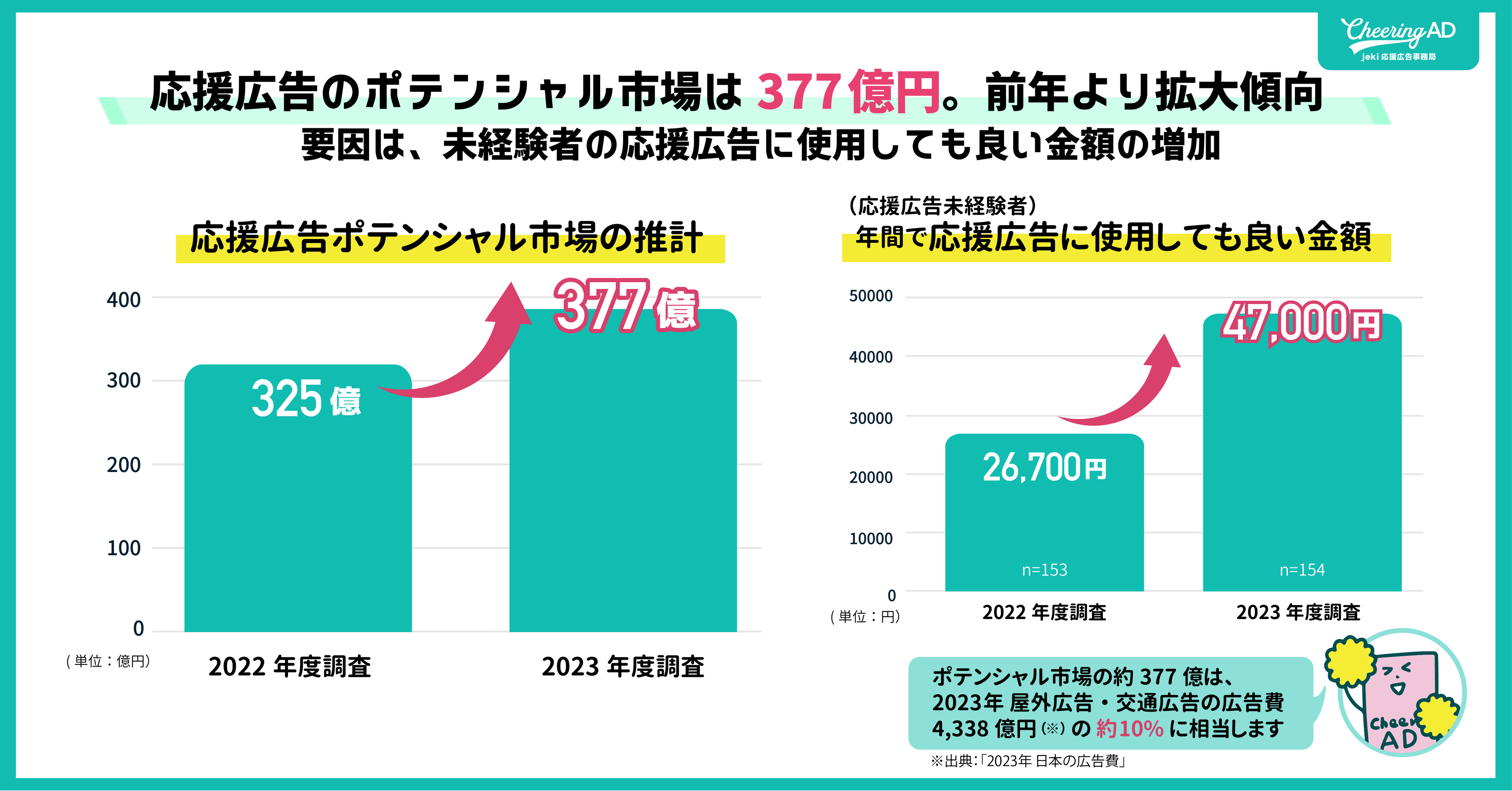 一般の消費者が、自身が好きで応援したいと思う“推し”の広告を出稿する「応援広告」のポテンシャル市場の推計は377億円で、昨年よりも拡大していることがわかりました。