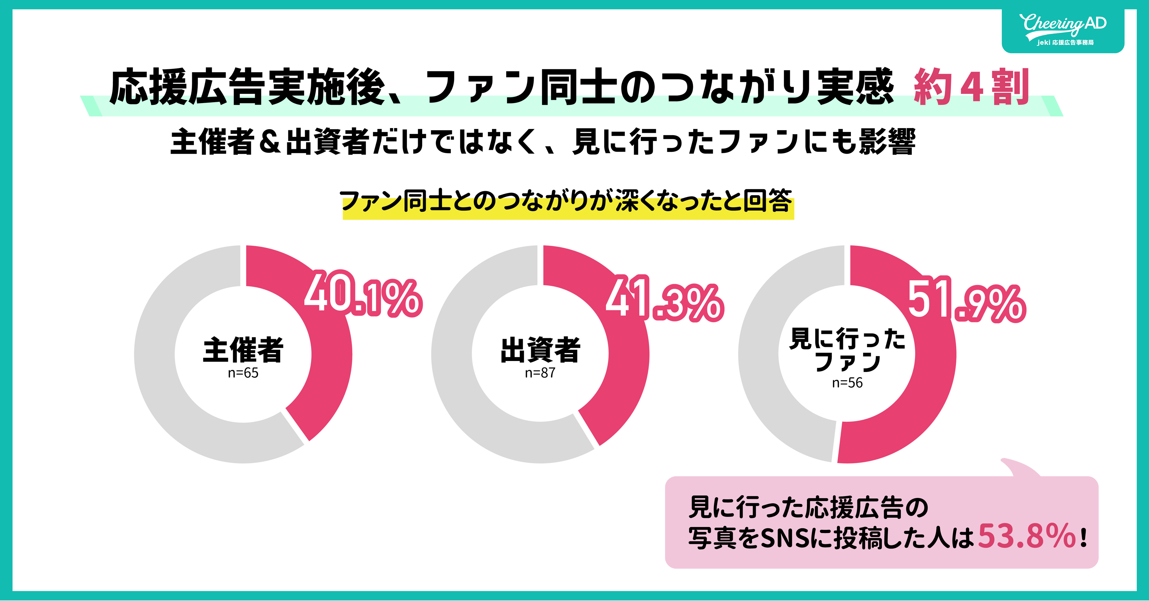 応援広告実施後、主催者・出資者の約4割がファン同士のつながりが深くなったと回答。広告を見に行ったファンにおいては、約5割がファン同士のつながりの深さを実感しています。