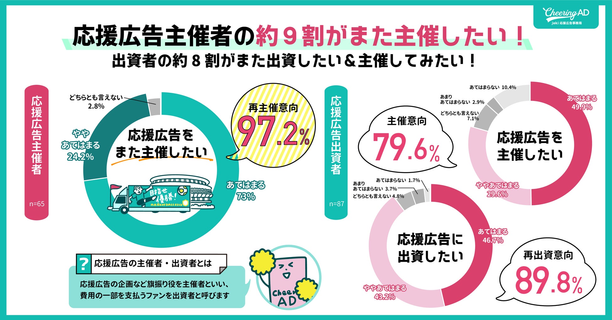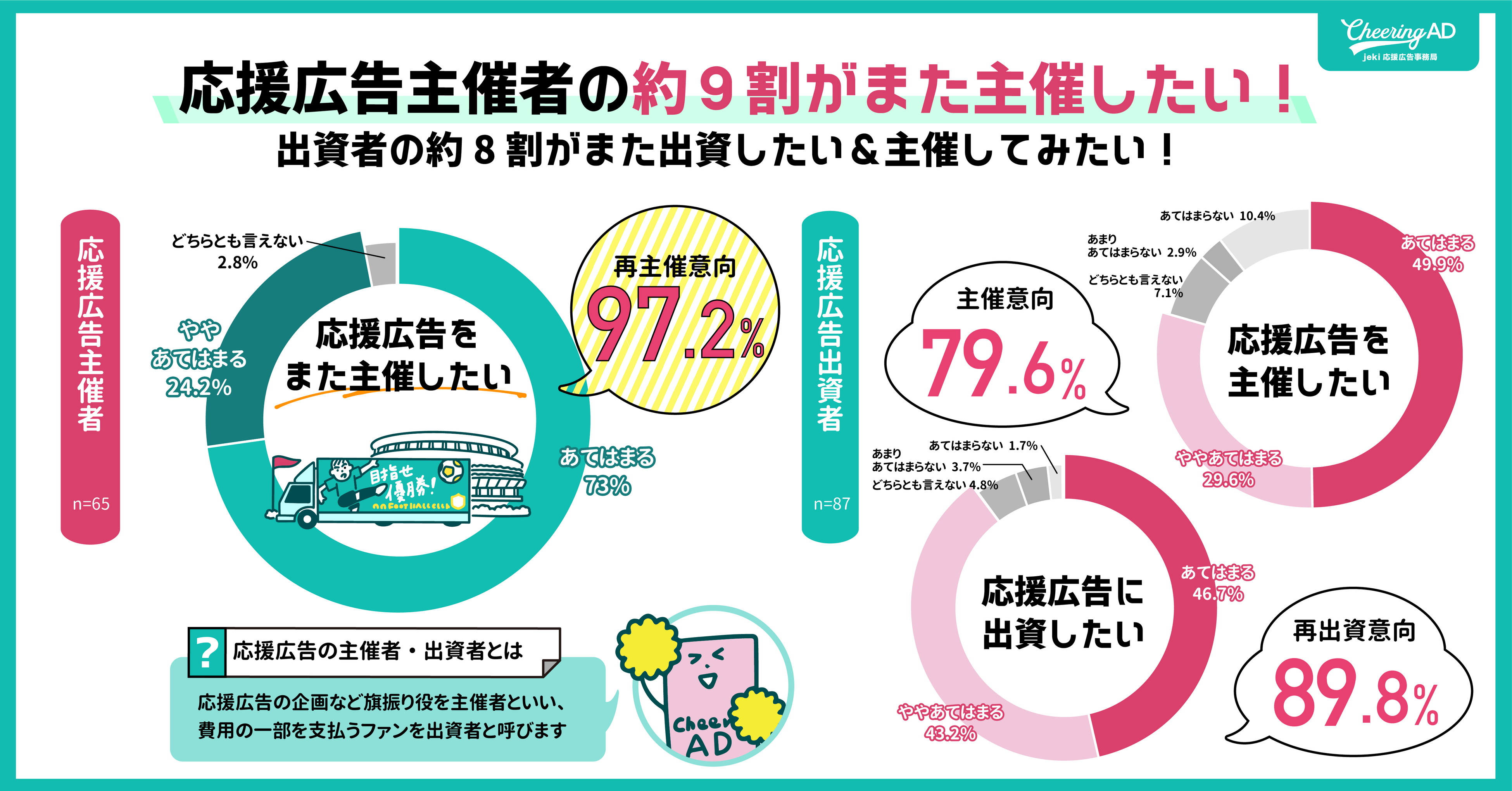 応援広告主催者の約9割がまた主催したいと回答。応援広告出資者の約8割が再出資意向、約7割が主催しても良いと回答しました。再実施意向が非常に高いことがわかりました。