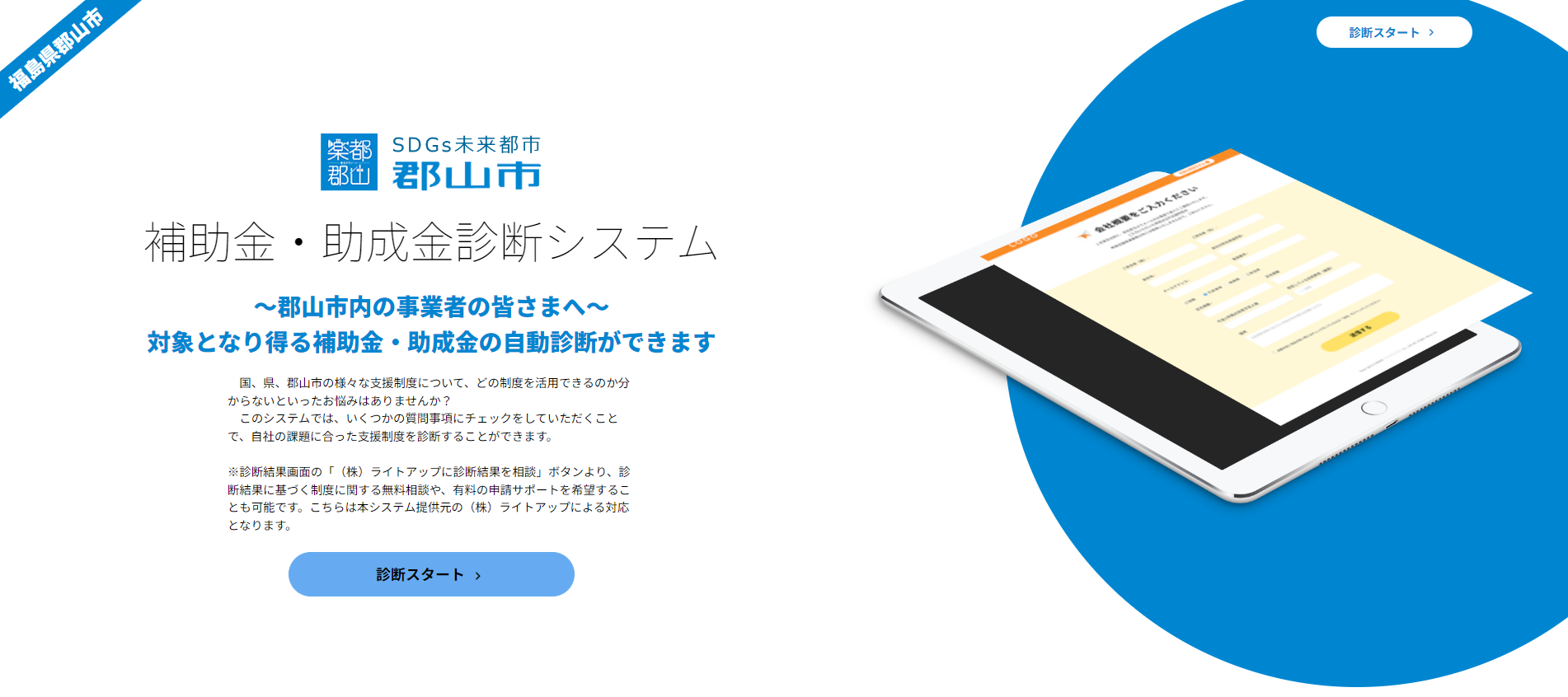 【25自治体目】ライトアップ、郡山市へ「Jシステム(補助金・助成金自動診断システム)」を提供開始。市内事業者に向けた支援体制の強化を共同実施
