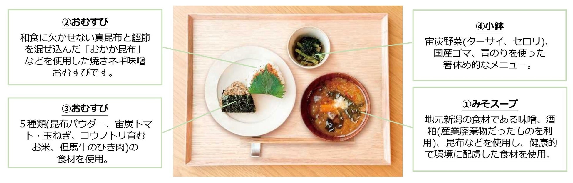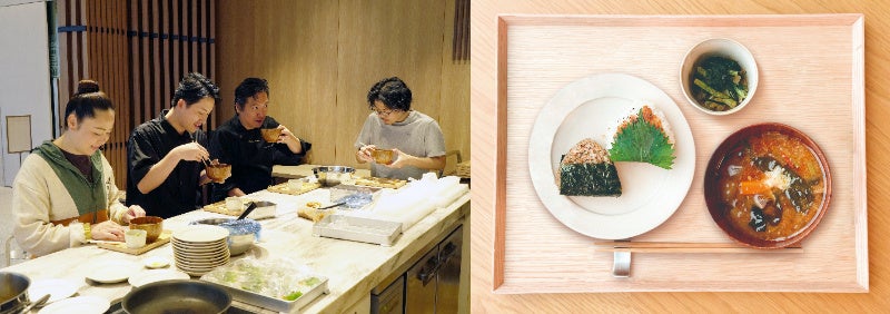 提供される「地球に優しいおにぎり&みそスープセット」には、「丸の内シェフズクラブ」のフレンチ・和食・イタリアンと、ジャンルを超えた4人のシェフが担当・監修を行いました。一汁一菜というシンプルなメニューだからこそ、食材や作り手のバックストーリーに寄り添い、食の未来への想いを込めて考案した特別なメニューです。