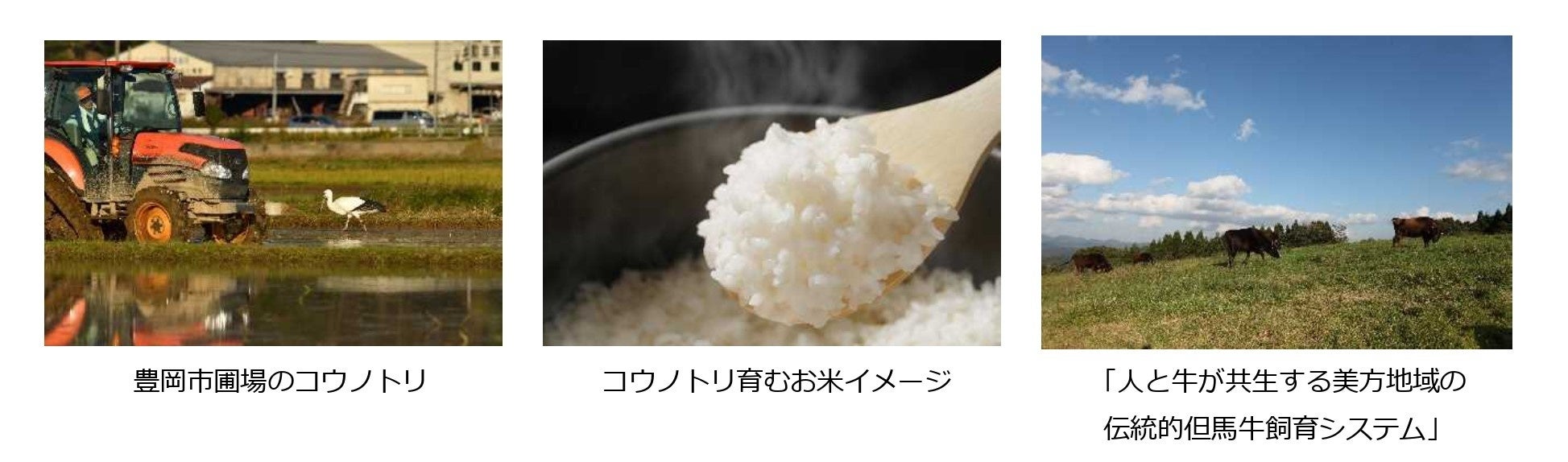 兵庫県北部・但馬地域において環境創造型農業と畜産業を実践する「JAたじま」。今回使用した「コウノトリ育むお米」は、カエルやドジョウなど、コウノトリのエサとなる生き物が育つ環境づくりに取り組み、コウノトリの野生復帰を支える農法で栽培・収穫されています。また「但馬牛」は、草原放牧や棚田畔草の給餌によって、農村環境や多様な生物資源を保全。環境的な課題の多い現代の畜産業において、ネイチャーポジティブなシステムを構築しています。