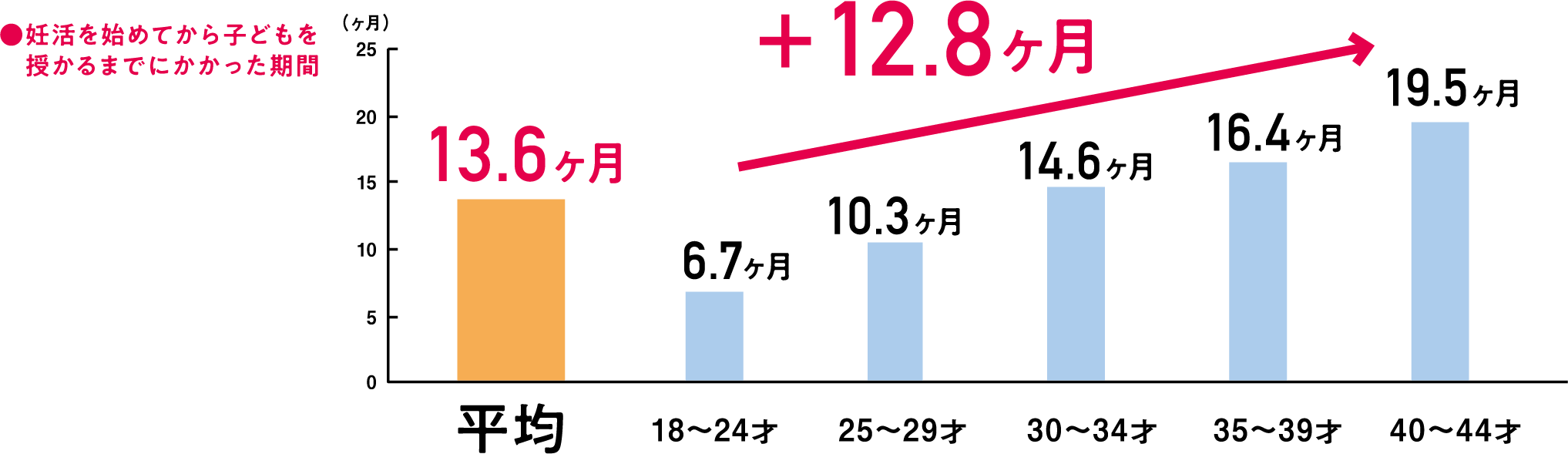 ②妊活で子どもを授かった女性が、実際に妊活を始めて子どもを授かるまでの期間は平均13.6ヶ月。