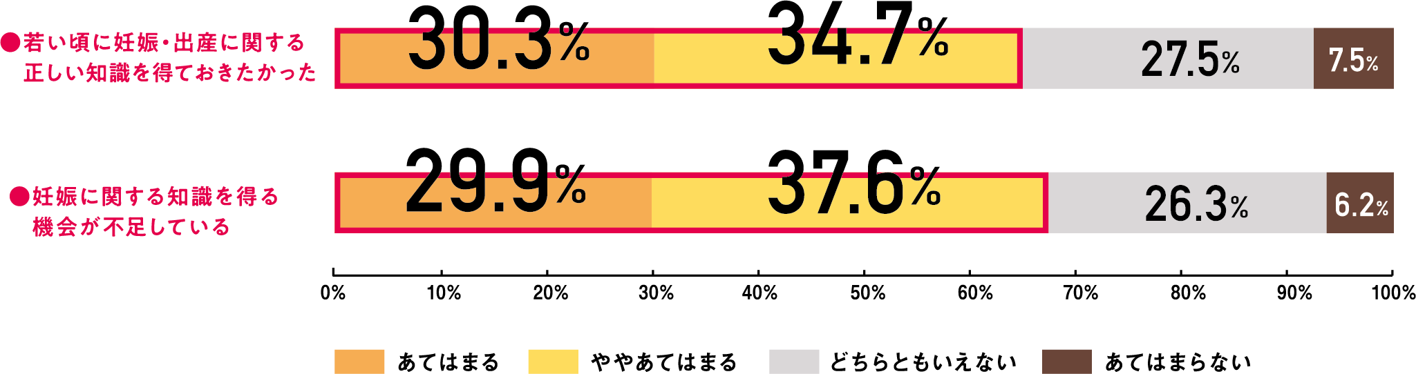 妊活を経て子どもを授かった経験のある女性の65.0%は、「若い頃に妊娠・出産に関する正しい知識を得ておきたかった」、67.5%は「妊娠に関する知識を得る機会が不足している」と答え、早くから正しい知識を得ることの必要性も明らかとなりました。