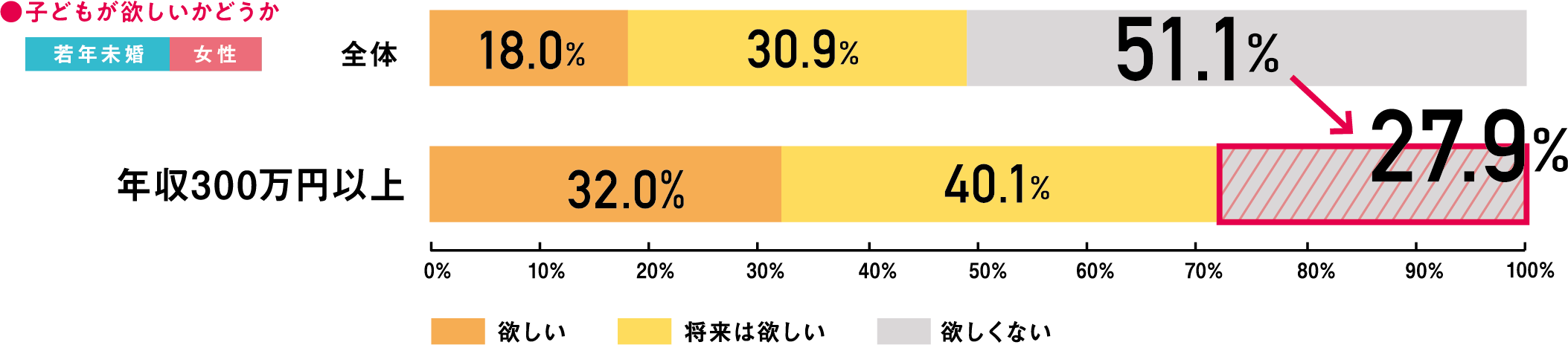 若年未婚女性の中で、個人年収が300万円以上と20代女性の平均年収を超える層では、子どもを望まない人の割合が27.9%まで低下しました。このことから、安定した収入のある女性は、若年層の中でも子どもを望む傾向が見られます。