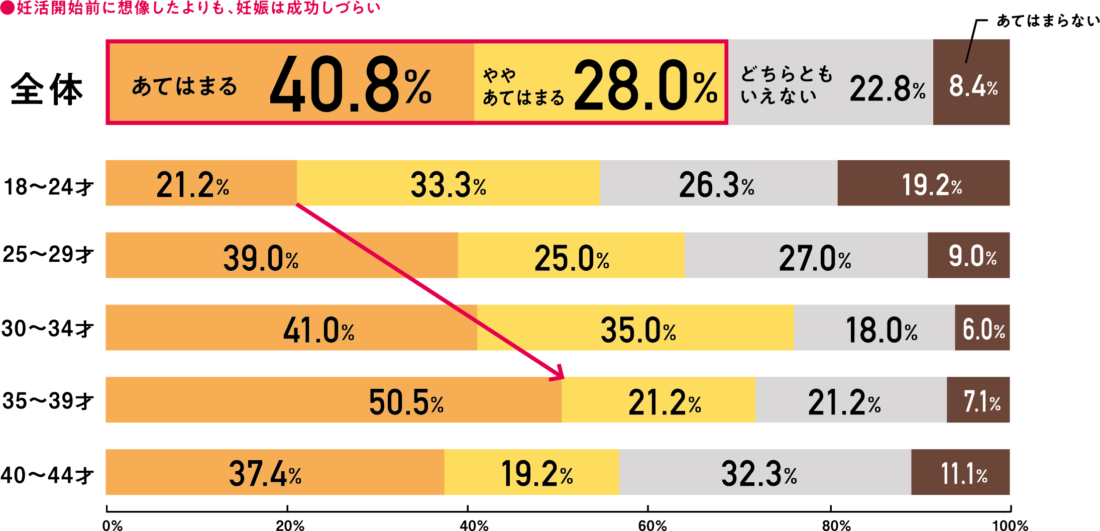 実際に妊活を経て子どもを授かった経験のある女性の68.8%が、「妊活開始前に想像したよりも妊娠は成功しづらい」と回答。58.4%は「もっと早くから妊娠のための準備や妊活を始めておいた方が良かった」と答えました。出産時の年齢が上がるにつれて、いずれの問いに対する割合も上昇し、30代後半で出産した層においては、どちらも7割を超えています。